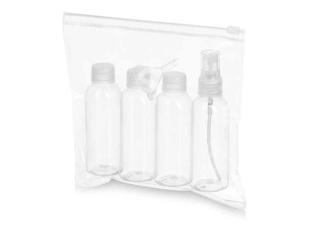 Флакончики объёмом 80 мл подойдут для шампуня, геля для душа и других косметических средств, один флакон оснащён распылителем. Бутылочки упакованы в прозрачный непромокаемый пакет на zip-lock застёжке, который дополнительно защищает багаж.