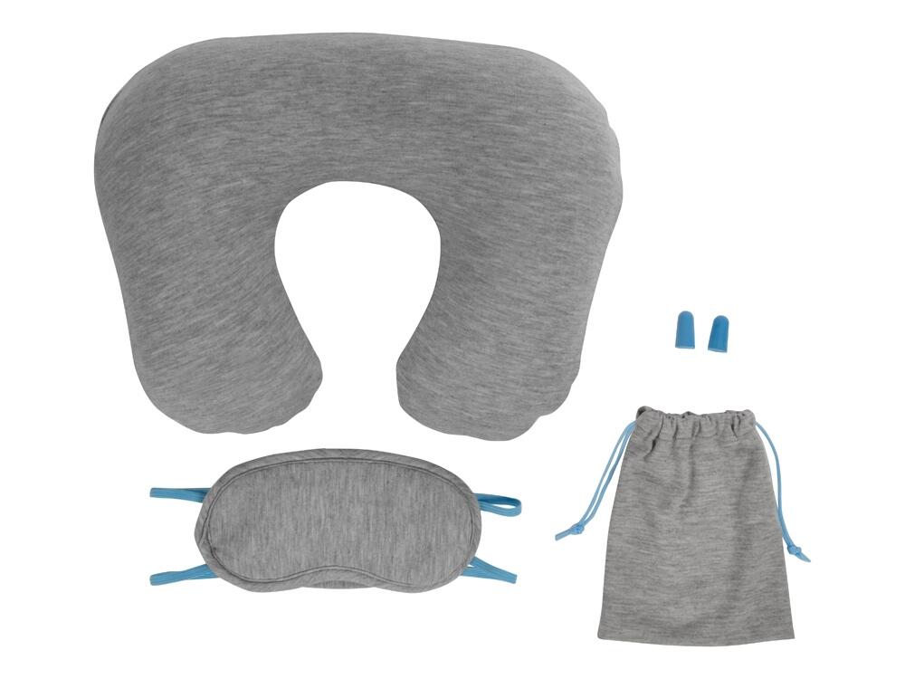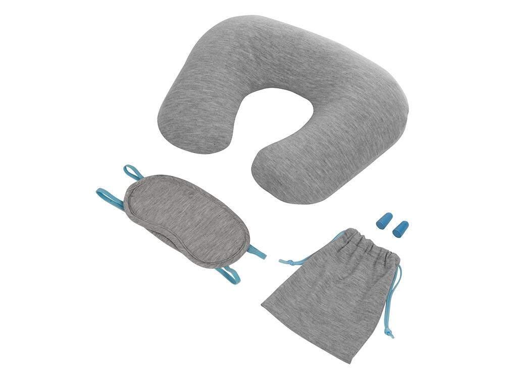Набор выполнен из мягких комфортных материалов и включает в себя надувную подушку, маску для глаз, беруши и мешочек на завязках.