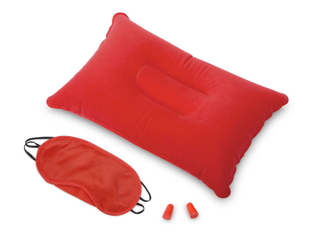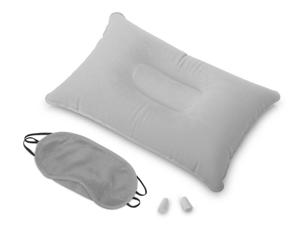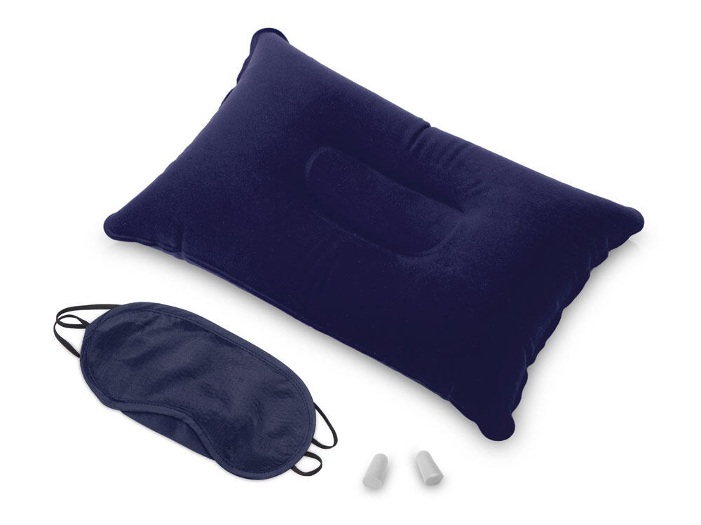 Путешествуйте с комфортом вместе с дорожным набором "Cloud", который включает в себя подушку из ПВХ прямоугольной формы, повязку на глаза и полиуретановые беруши.