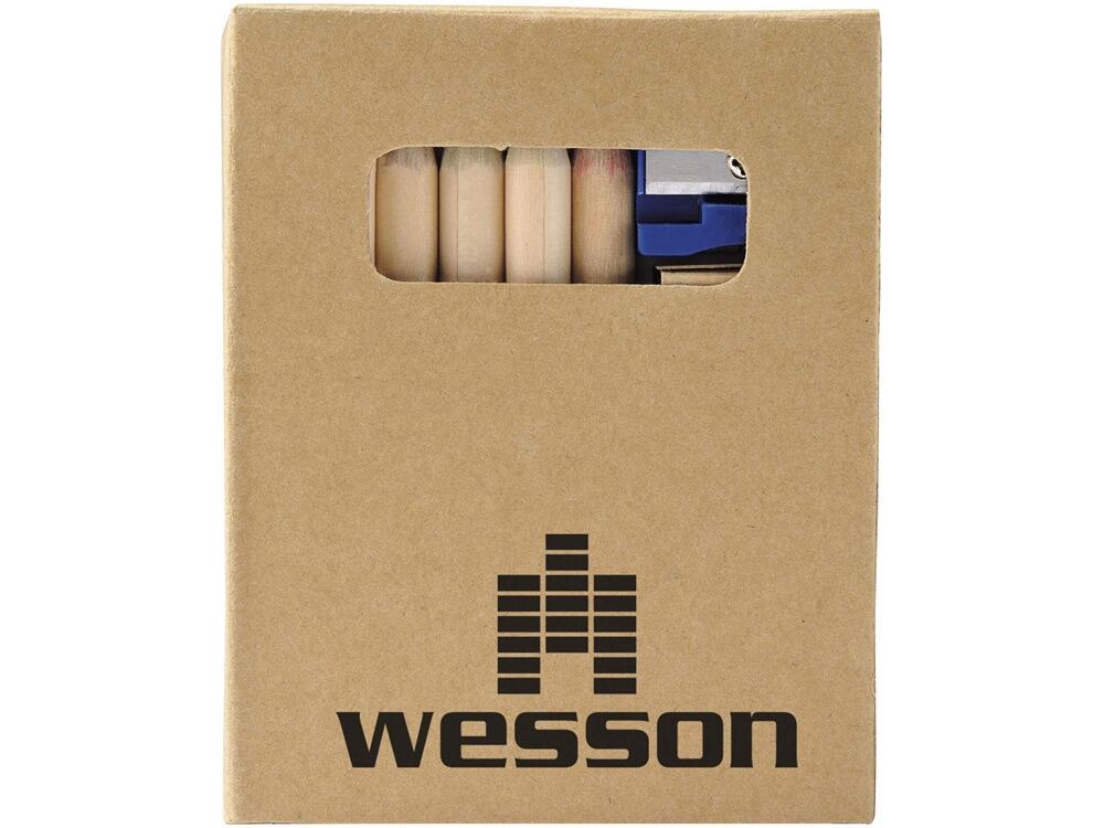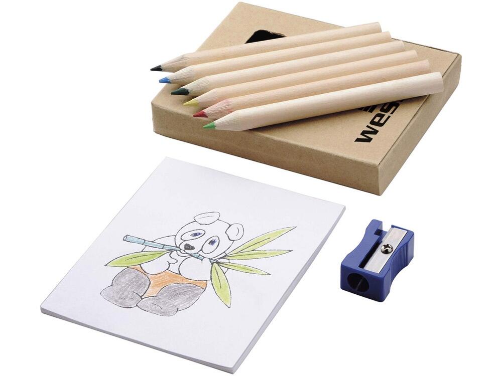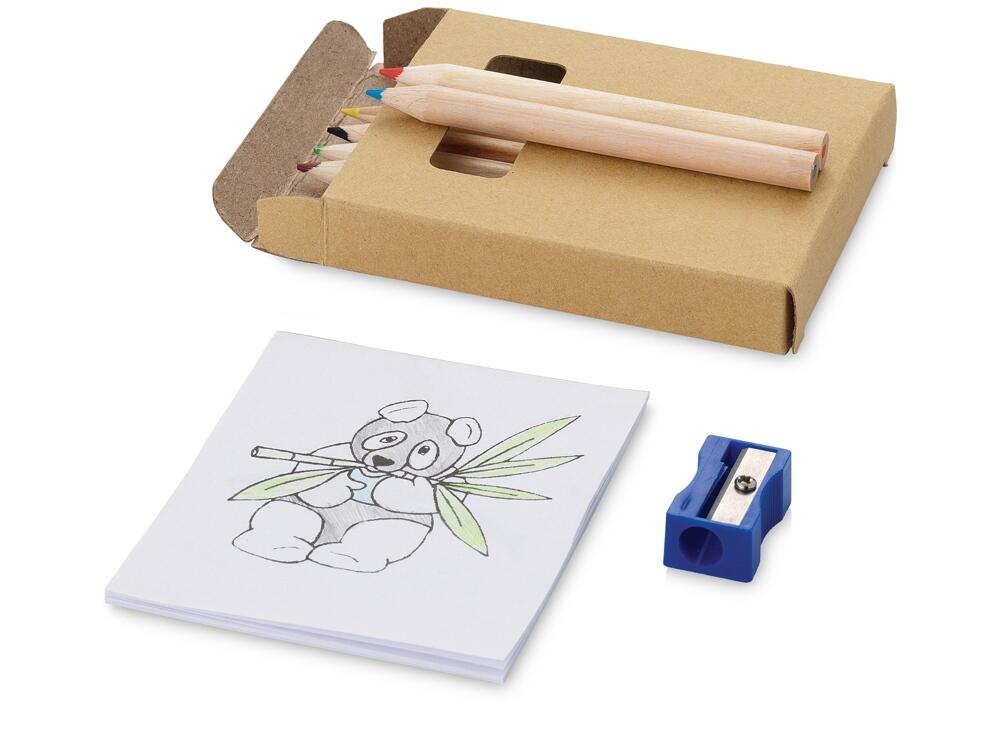 Оригинальный набор для рисования будет отличным промо-сувениром для любой акции креативного направления. Также отлично подойдет для продвижения дизайнерской студии. В наборе 6 цветных карандашей, точилка и раскраска. Комплект упакован в картонную коробку.