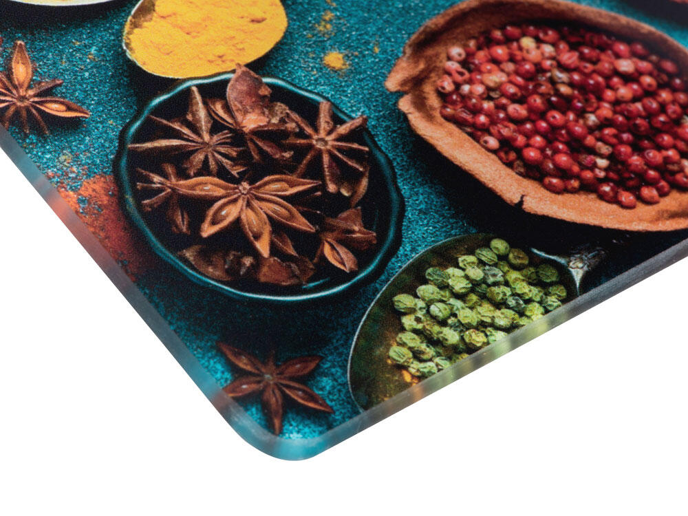 - возможность полноцветного нанесения на доску (УФ печать наносится со стороны, которая не соприкасается с пищей, изображение наносится в зеркальном виде)