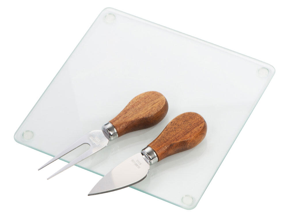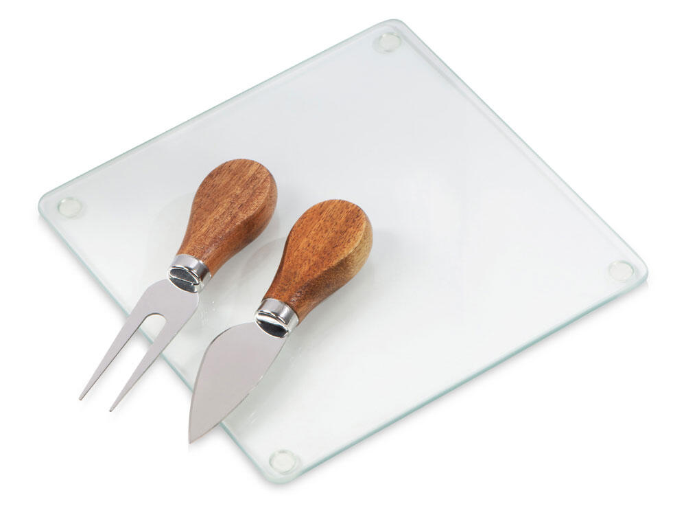 Набор для подачи закусок Dorblue состоит из стеклянной доски, вилки и ножа.