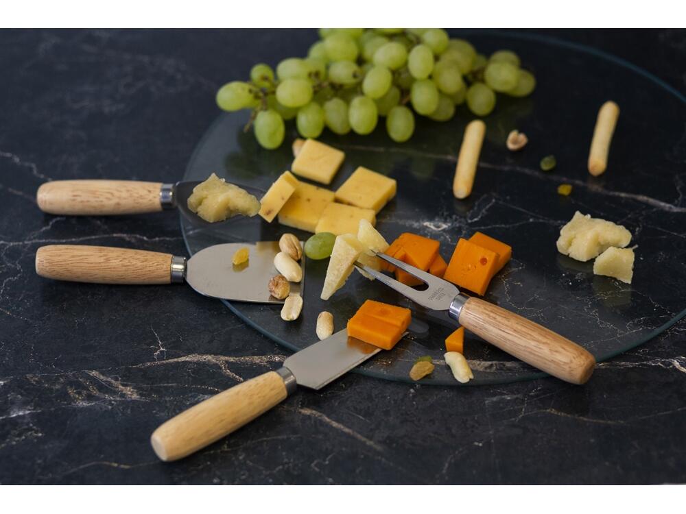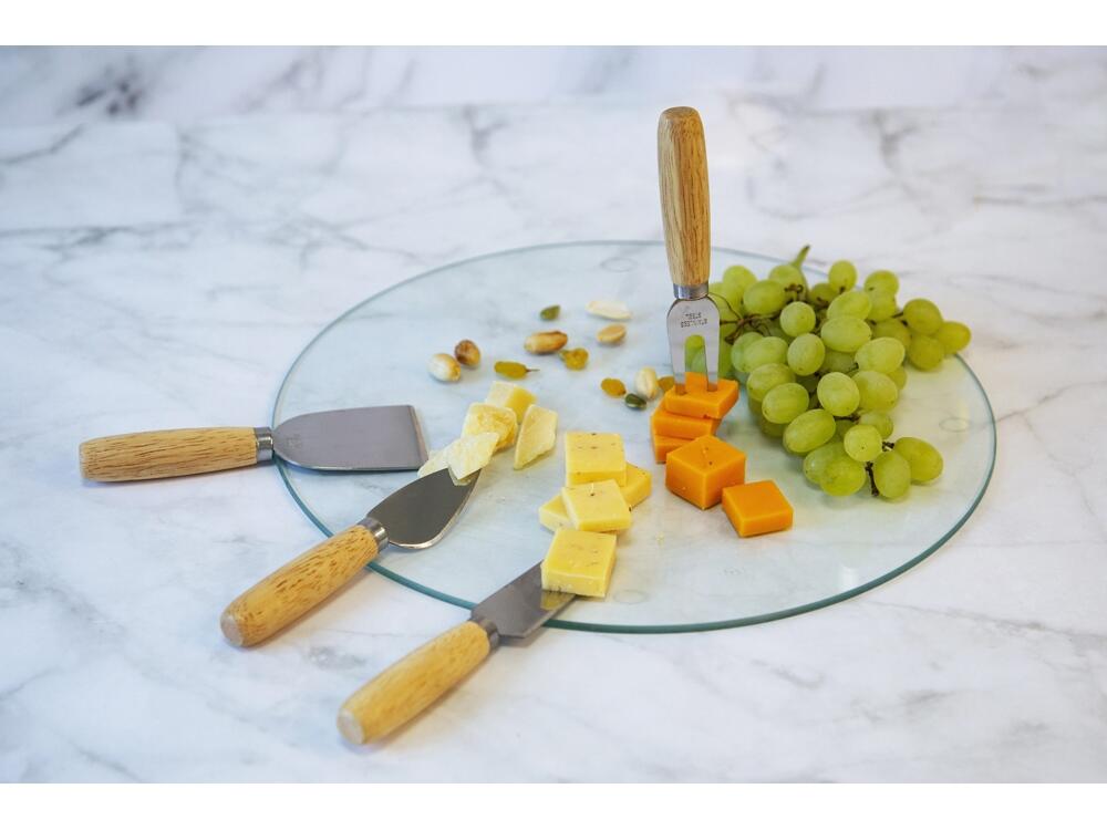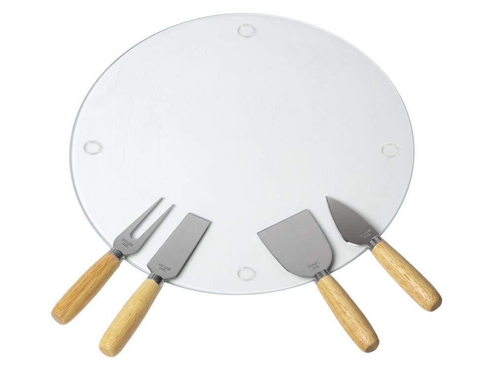 Размерстеклянная доска 30 x 0,4 см, нож для твердого сыра 13,5 см, нож для мягкого сыра 14,2 см, вилка для сыра 14 см, нож для пармезана 13,8см