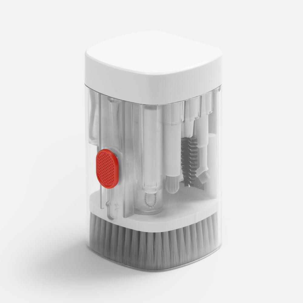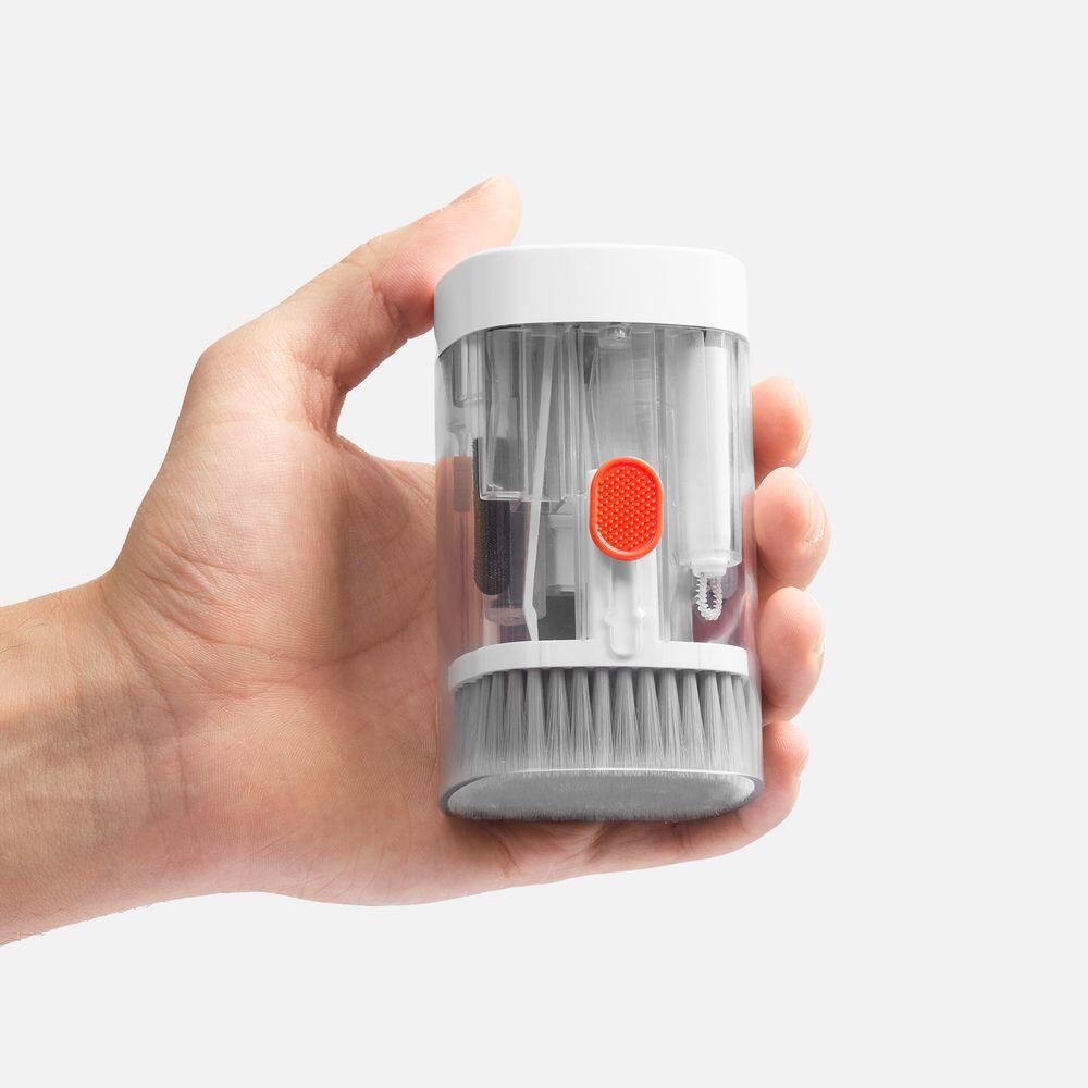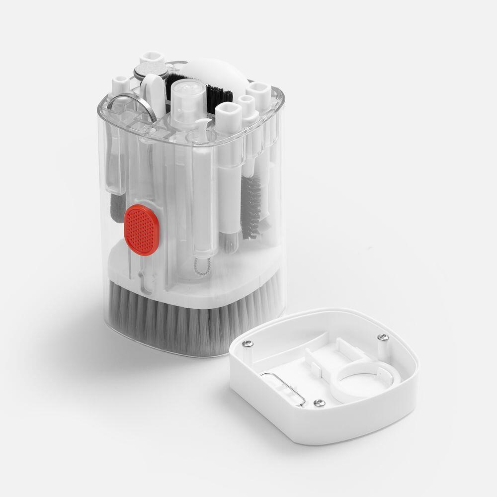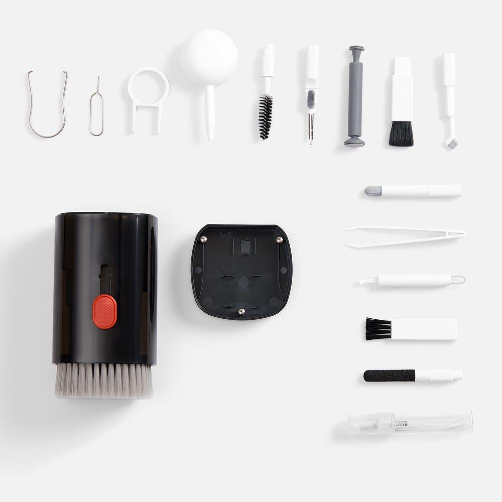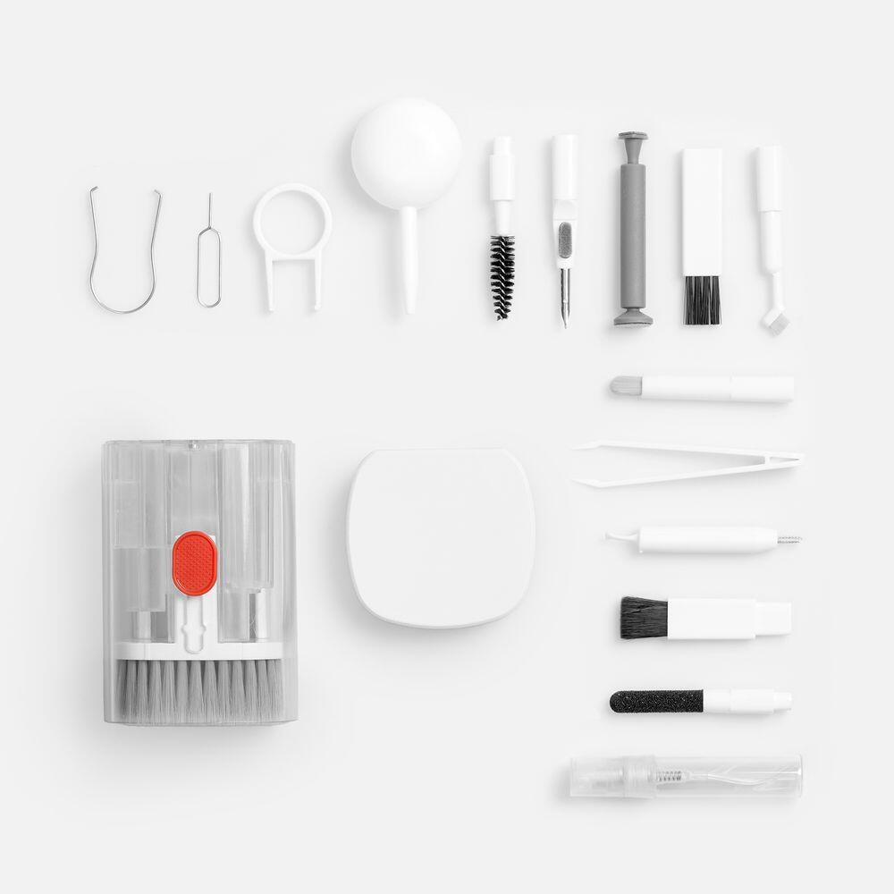 В комплекте: большая щетка, салфетка для ухода за дисплеем, контейнер для жидкости, пластиковый пинцет, щетка с жесткой щетиной, щетка с мягкой щетиной, чистящее перо со щеткой для наушников, насадка для чистки кейса от наушников, ершик для чистки кейса от наушников, щетка с короткой щетиной, щетка с наклонной щетиной, двусторонняя насадка для чистки разъемов зарядки, двусторонняя насадка для чистки камеры, инструмент для продувки, дуговой пинцет, ключ для отсека SIM-карты, инструмент для извлечения поврежденных ключей