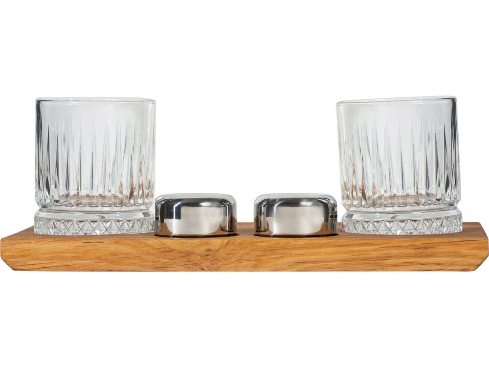 Набор Master of Wine состоит из дубовой подставки для сета, двух бокалов для крепких напитков и двух шайб из нержавеющей стали. Весь набор упакован в картонную фирменную коробку бренда — можно смело дарить!