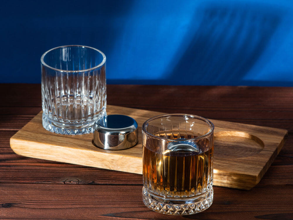 Бокалы выполнены из содового стекла, предназначены для подачи виски и коктейлей на его основе. Утолщенное дно помогает дольше сохранять температуру напитка, не нагреваясь, что благоприятно влияет на вкус виски, помогая ему раскрыться. Рельеф бокала напоминает огранку драгоценного камня, многократно преломляя свет, проходящий сквозь виски.