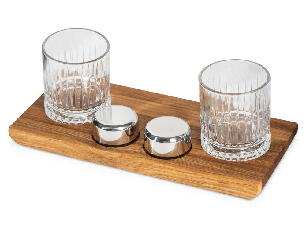 Для сервировки в набор входит дубовый поднос с выемками под бокалы и шайбы.