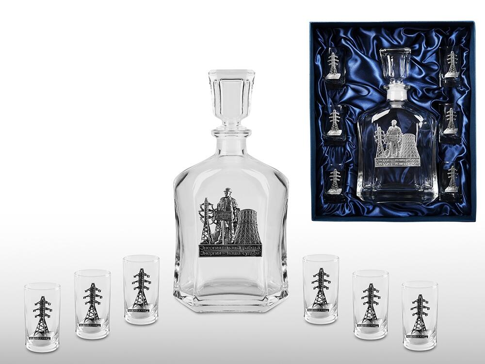 Подарочный набор со штофом «Энергетики». Традиционная для русского человека комплектация: элегантный графин емкостью 700 мл. с оловянным барельефом «ЭНЕРГЕТИК» и 6 стопок емкостью 50 мл. с оловянным барельефом «Опора ЛЭП». Материал барельефов: сплав с содержанием олова не менее 95%(пьютер). Художественное литье,чернение с эффектом антикварного серебра,полировка. Ручная работа. Подарочная упаковка «люкс» с атласным ложементом.