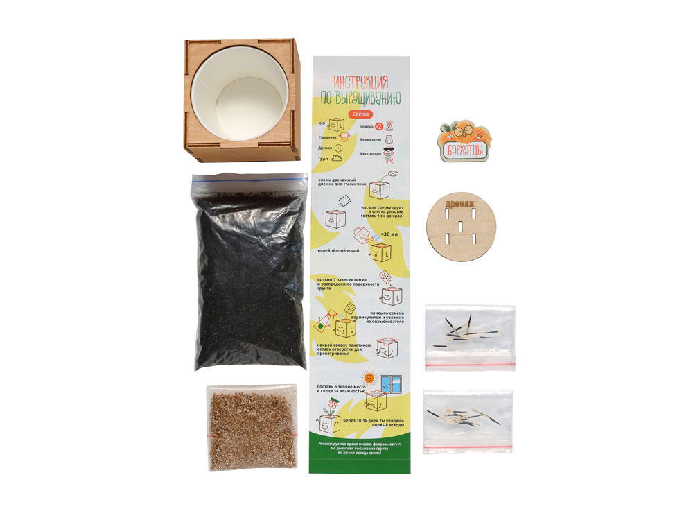 Набор включает: кубический горшок из натуральной берёзовой древесины, семена и специальный питательный грунт, подходящий для конкретного сорта.