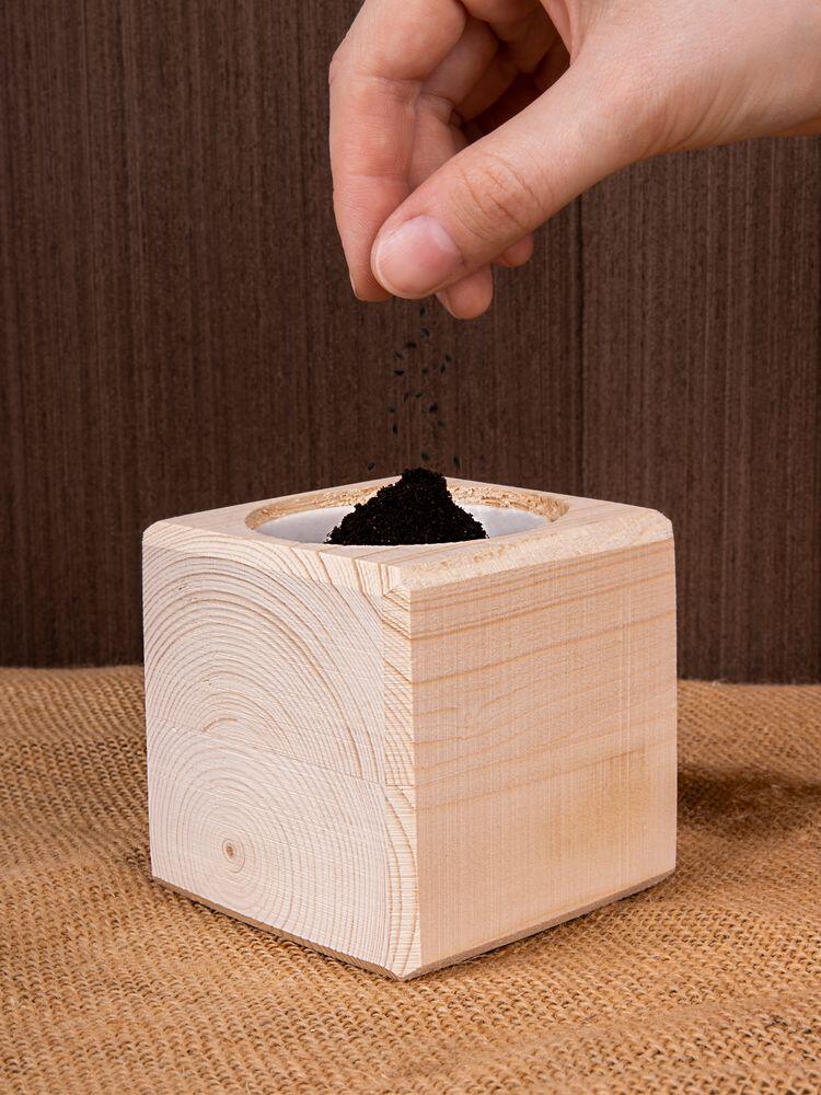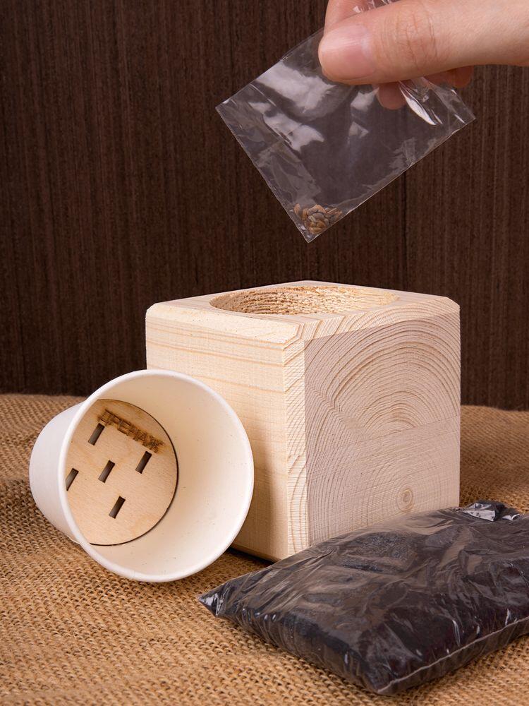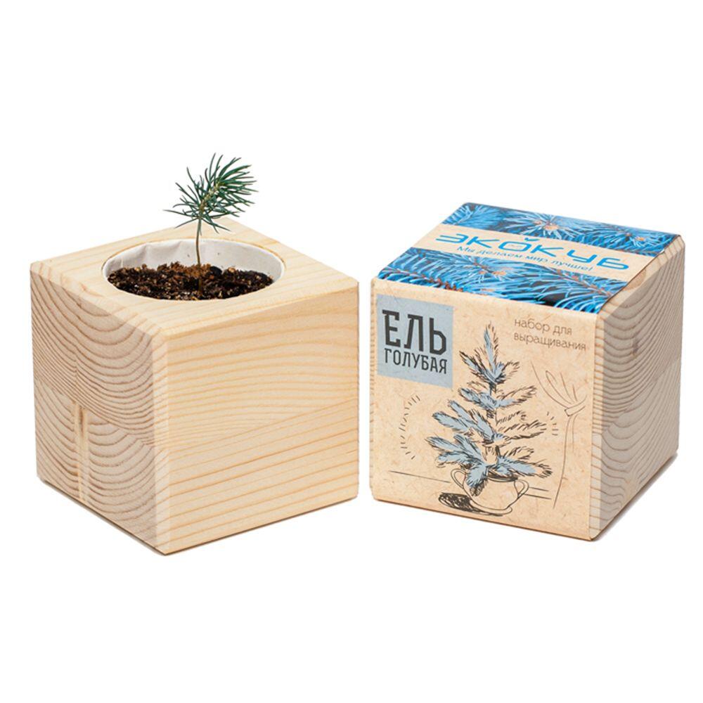 В наборе: деревянный куб, грунт, семена голубой ели.