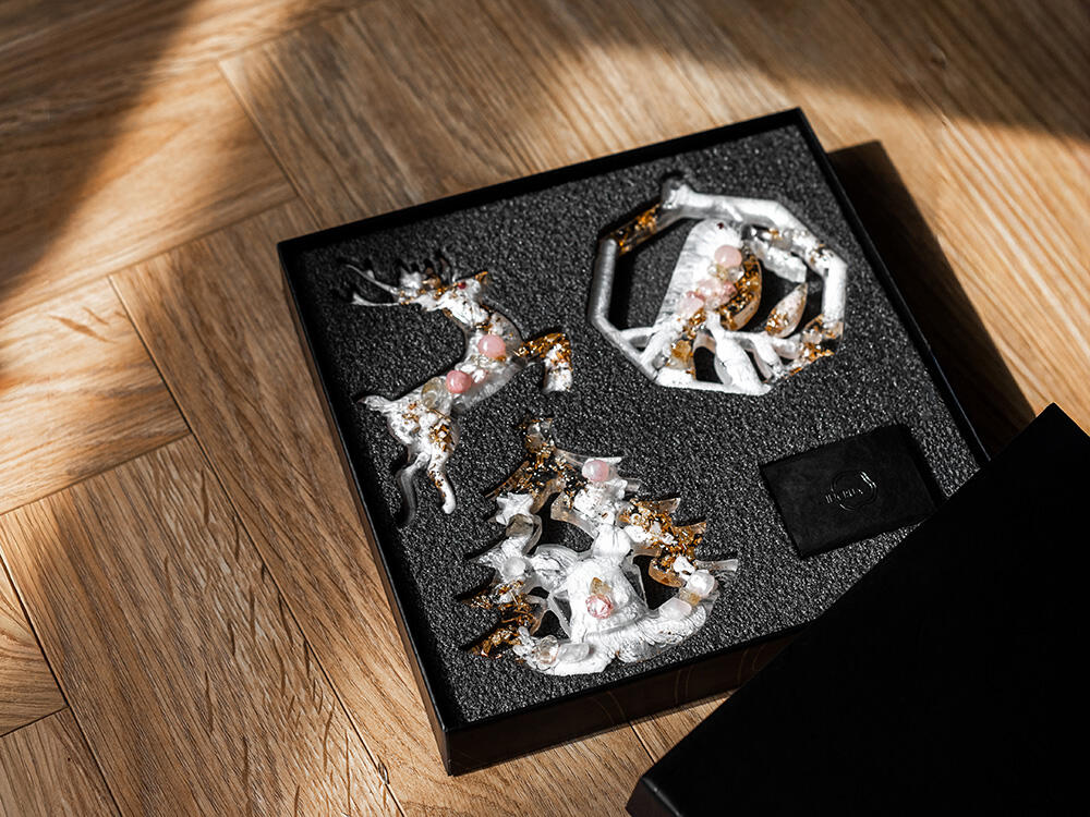 Набор из 3-х елочных игрушек: в форме оленя, снегиря и елки. Игрушки выполнены из ювелирной эпоксидной смолы и украшены галтовкой из натуральных минералов.