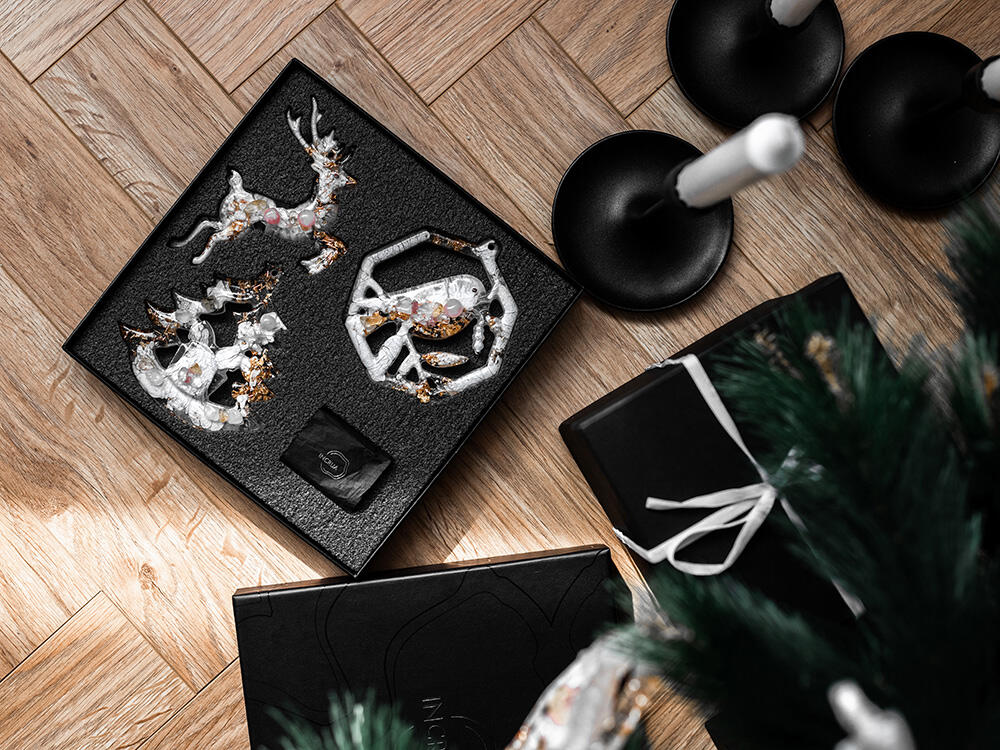 Игрушки бережно упакованы в картонную коробку с внутренним вкладышем, который надежно фиксирует их внутри. Для вашего удобства к каждой игрушке прилагается элегантная ленточка, с помощью которой вы легко сможете подвесить их на ёлку.