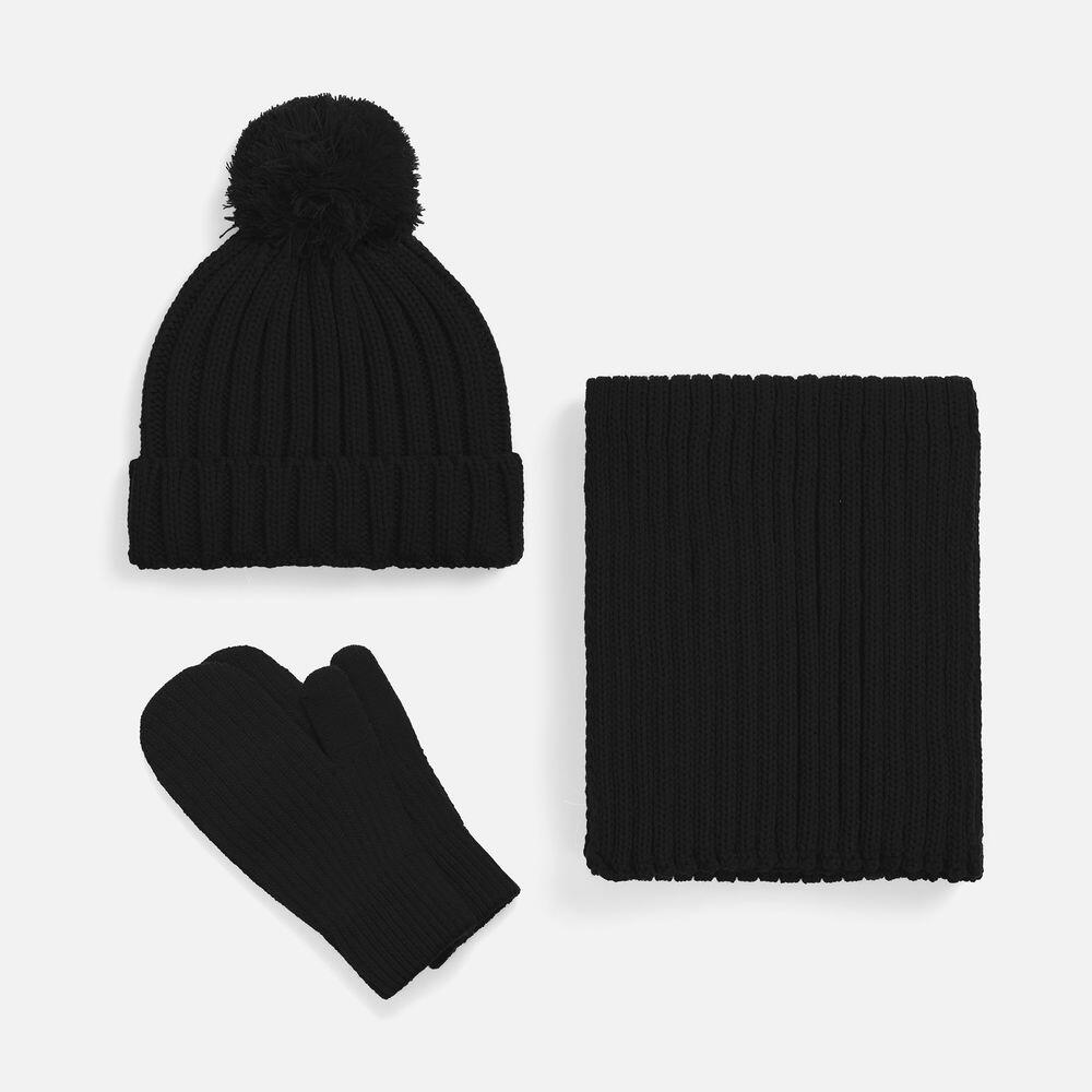 Шапка с пышным помпоном и отворотом, связанная крупной резинкой, создает игривый силуэт, а широкий шарф с выразительной текстурой надежно защищает от ветра, сохраняя свободу движений. Варежки с отворотом-резинкой плотно облегают запястье, не пропуская холод.
