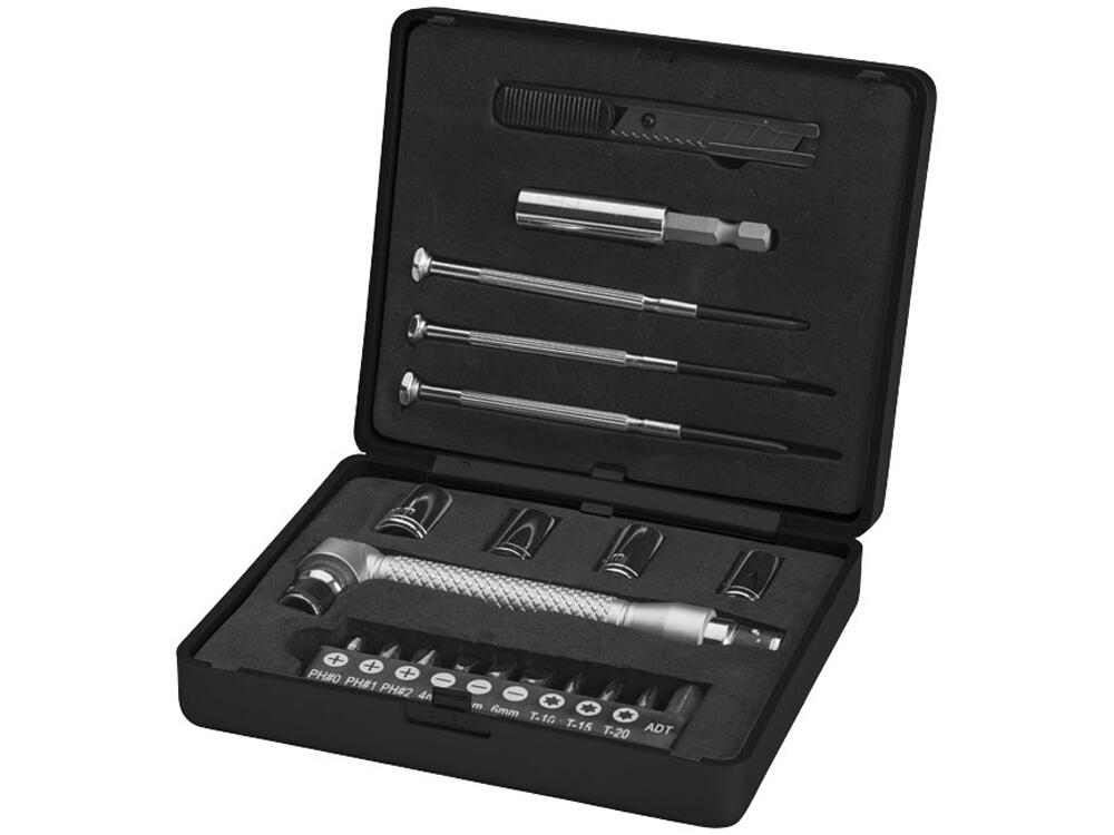 Набор из 20 инструментов в маленькой коробочке. В комплекте три отвертки, 10 насадок в холдере: три размера Philips (PH0, PH1, PH2) три плоских (4,5,6 мм), три звездочкой (Т10, Т15, Т20) и 1 адаптер; четыре ключа ( 7, 8, 9, 10 мм), один ножик, ручка и коннектор. Упакован в коробку STAC. АБС пластик.