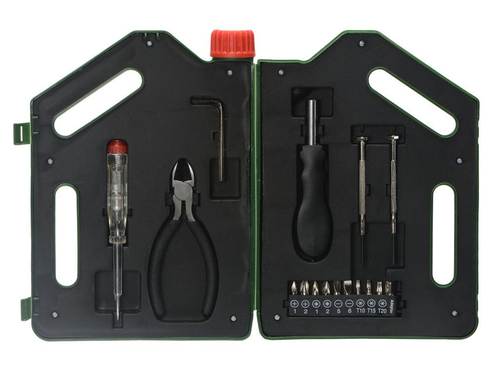 Набор инструментов в футляре в виде канистры включает в себя 1 тестер напряжения, 1 пару плоскогубцев, 1 шестигранный ключ, 1 рукоятку, к которой можно крепить отвертки, 2 прецизионные отвертки, 1 крестообразную головку, 1 плоскую головку, 10 бит.