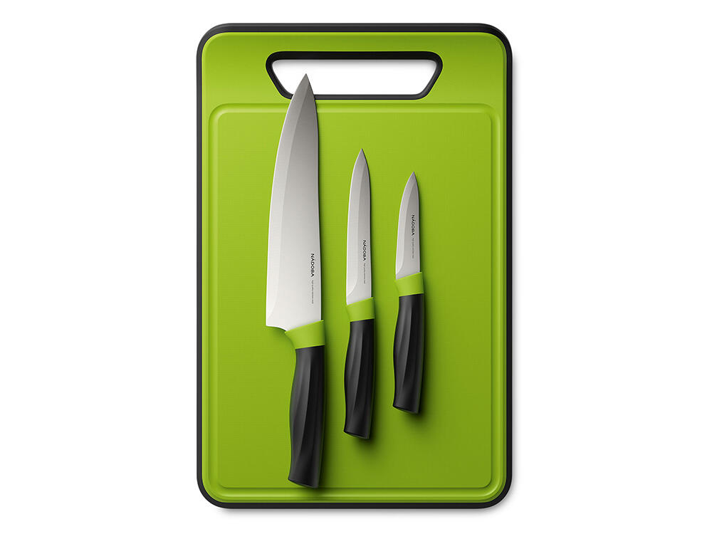 Набор из 3 ножей с доской NADOBA серии Olivia состоит из: нож овощной, 9 см, нож универсальный, 12,5 см, нож поварской, 20 см и разделочной доски 37,5х25х0,8 см.