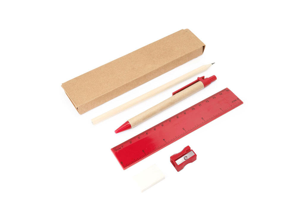 Канцелярский набор. Включает ручку с картонным корпусом и синими чернилами, деревянный карандаш, точилку для карандашей, ластик и линейку длиной 15 см.