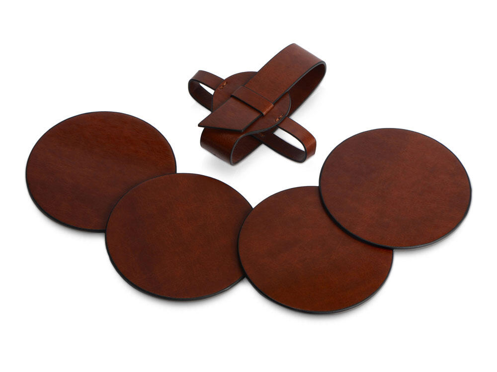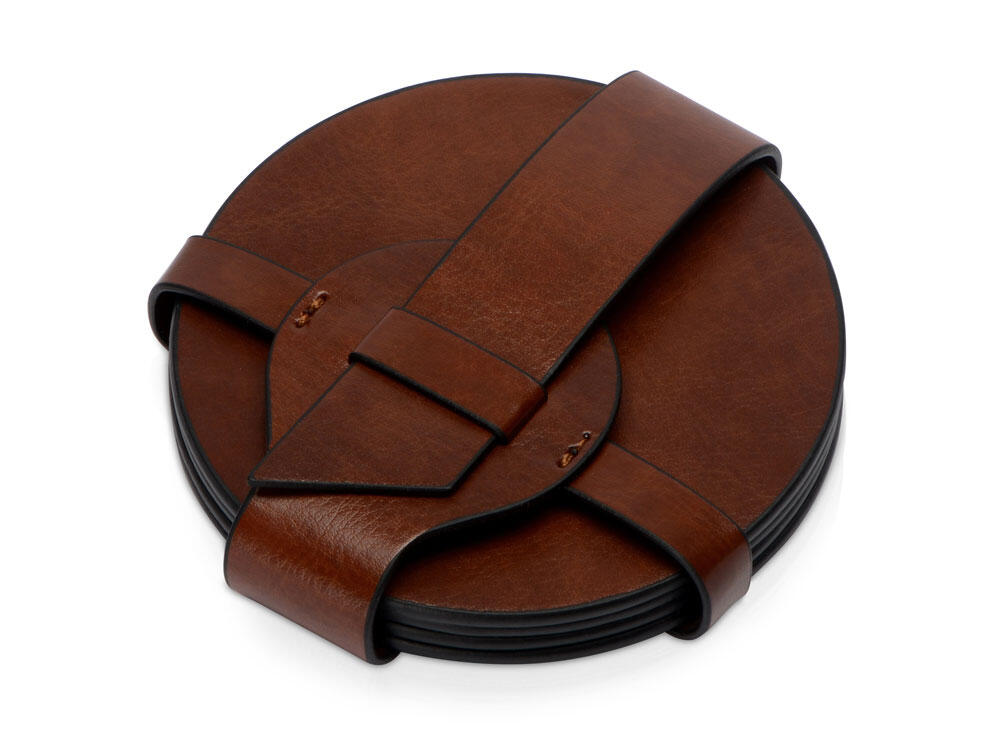 Набор состоит из четырех подставок и ремня-чехла, с помощью которого костеры очень удобно хранить в одном месте. Подставки круглой формы идеально подойдут для бокалов разного диаметра. Универсальная форма, легко моющийся материал, персонализация на самих костерах, а также ремешке.