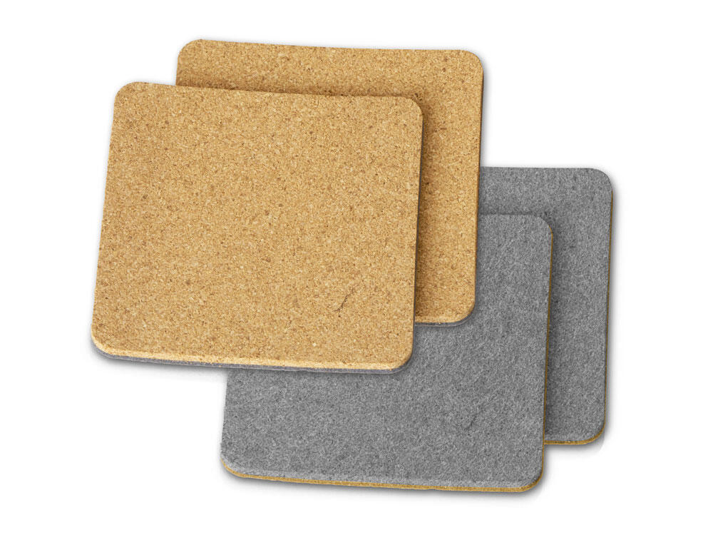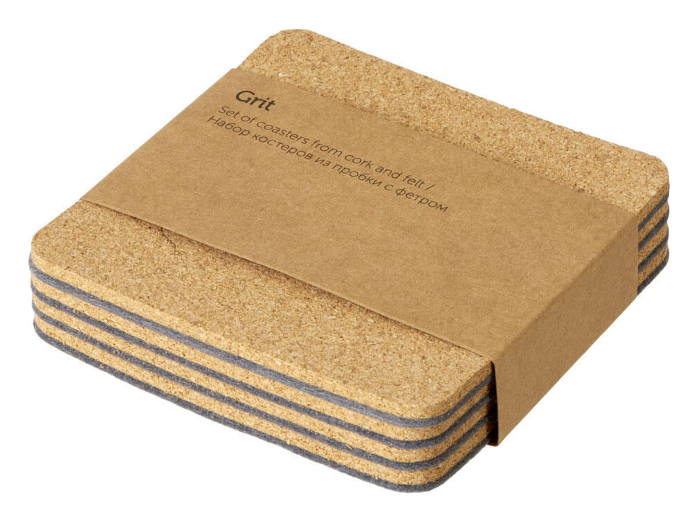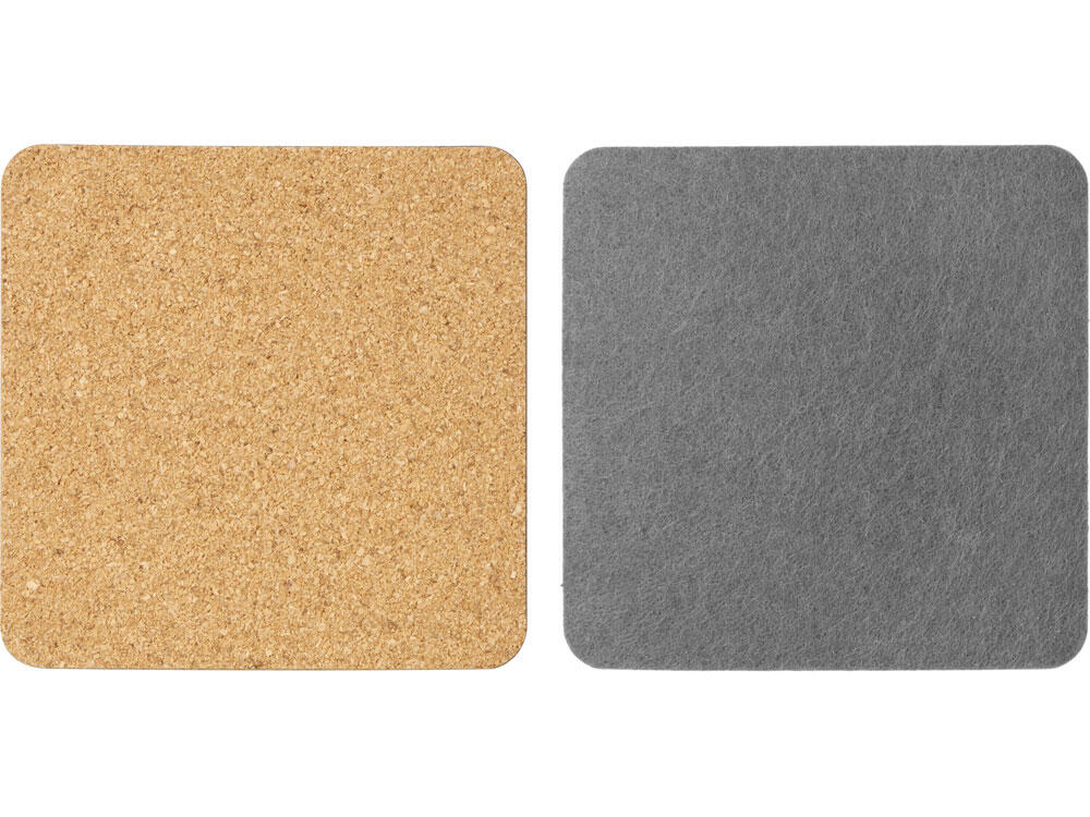 Четыре квадратных костера, выполненных из фетра и пробки. Благодаря выбору материалов «посадка» стаканов — мягкая и бесшумная: и пробка, и фетр заглушают звук, безопасны и для посуды, и для поверхности стола, защищая от механических повреждений и загрязнения.