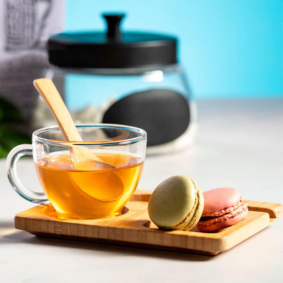 Чашка сделана из боросиликатного стекла, ложка и поднос изготовлены из бамбука.