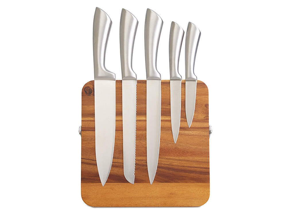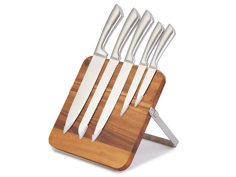 Набор ножей «Терон» на магнитной подставке из акации — это отличное решение для организации рабочего пространства на кухне. В комплекте пять ножей из нержавеющей стали и подставка, которая объединяет функциональность и природный стиль.