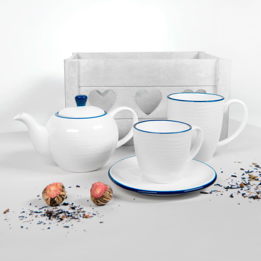 Чайная пара и чайник SEAWAVE выполнены в классическом нежном дизайне. Элегантное сочетание белой посуды с синим кантом всеми давно любимо. Волнообразное покрытие чашки, похожее на рябь на поверхности воды, и подарило название этому комплекту – «морская волна».