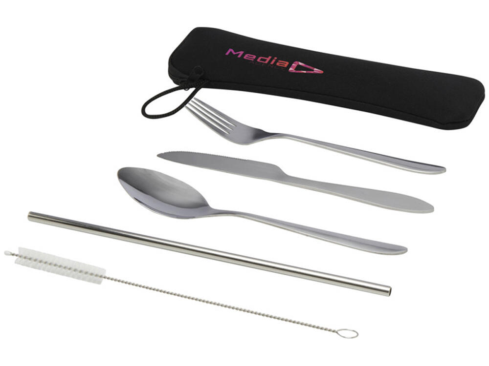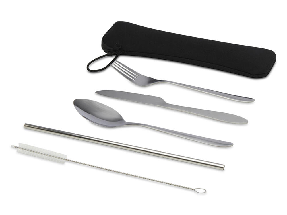 Набор столовых приборов "Sheen" включает вилку, нож, ложку, многоразовую соломинку и щёточку для её очистки. Все элементы выполнены из прочной и легко моющейся нержавеющей стали. Комплект удобно хранить и переносить в прочном чехле из неопрена с удобной петлей.