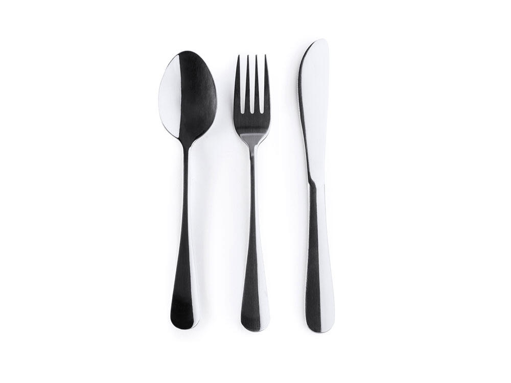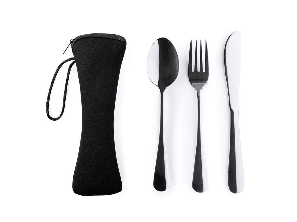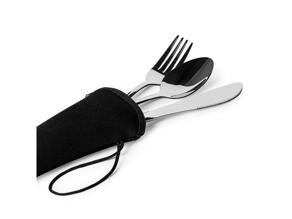 Набор столовых приборов из нержавеющей стали в практичном неопреновом футляре. Включает в себя вилку, нож и ложку, идеально подходящие для того, чтобы брать их с собой куда угодно.