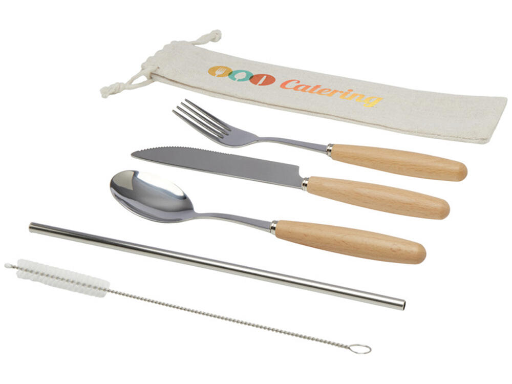 Набор столовых приборов Root — это стильное и практичное решение для тех, кто ценит удобство и экологичность. В комплект входят вилка, нож, ложка, многоразовая соломинка и щеточка для её чистки. Рабочая часть выполнена из прочной нержавеющей стали, а деревянные ручки из бука придают приборам естественный шарм и комфорт в использовании. Всё это аккуратно упаковано в компактный хлопковый мешочек — удобно брать с собой на пикник, в поездку или на работу.