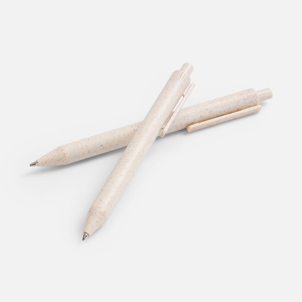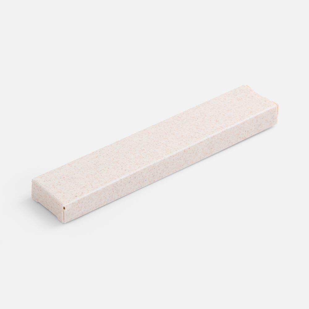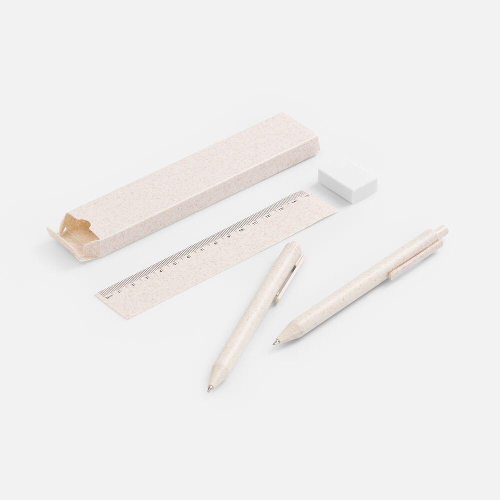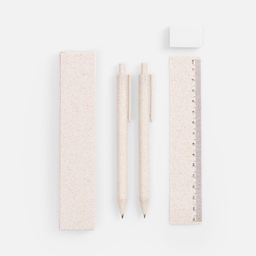 Wheat Hit — лаконичный и экологичный подарок. Весь набор, включая упаковку, выполнен из пластика с добавлением пшеничных волокон. Ручка, механический карандаш, ластик и линейка в коробочке, которая в дальнейшем может служить компактным пеналом.