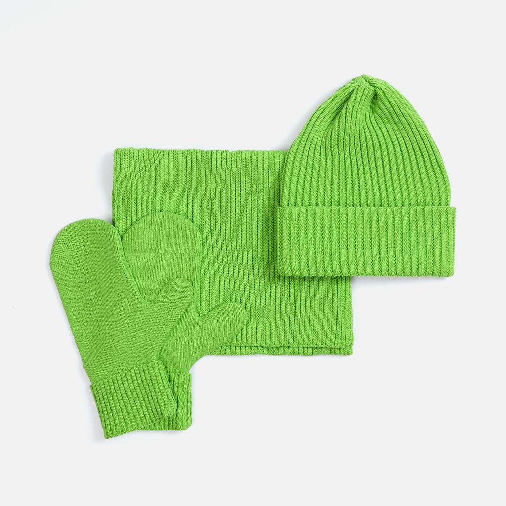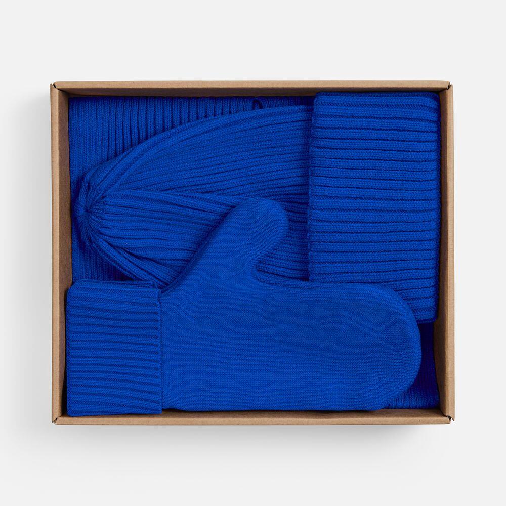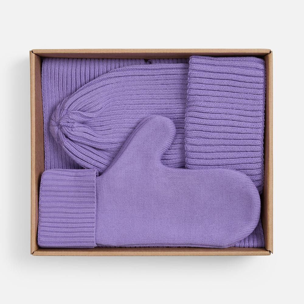 В набор входят удобный шарф с технологичным отверстием для быстрого завязывания, шапка с двойным отворотом и теплые двухслойные варежки с широкой манжетой. Все изделия связаны из акриловой пряжи, отличаются практичностью и элегантной простотой.