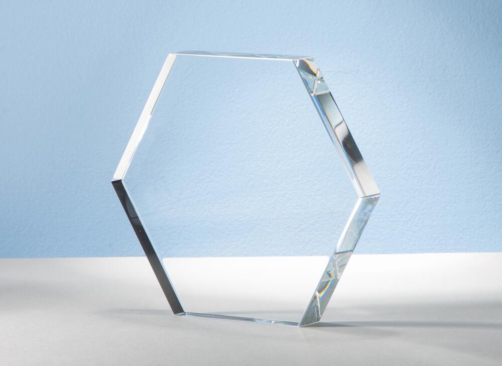 Награда выполнена из прозрачного стекла и не имеет постамента. Форма шестигранника часто встречается в природе, например, в пчелиных сотах, и является символом гармонии и изобилия.