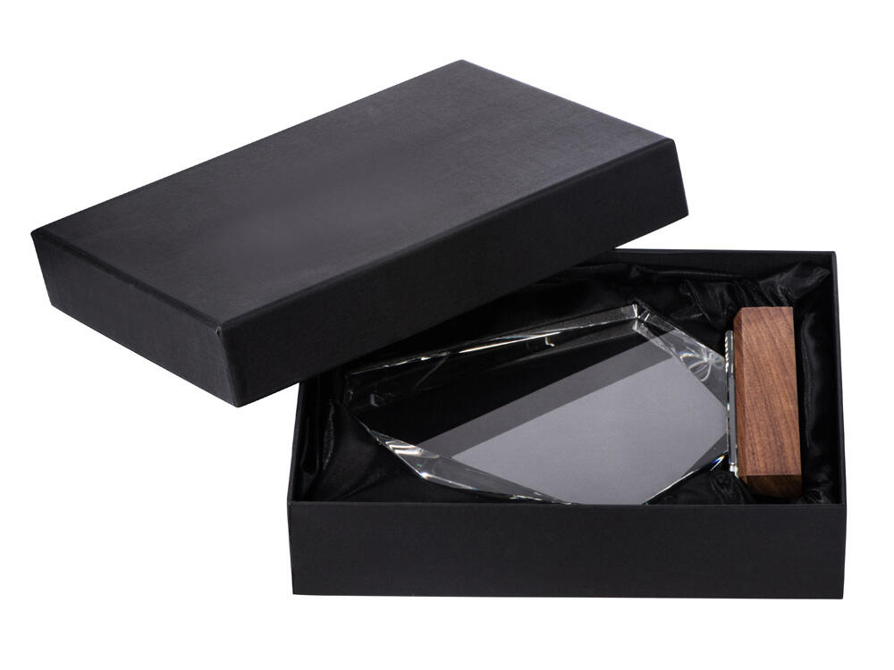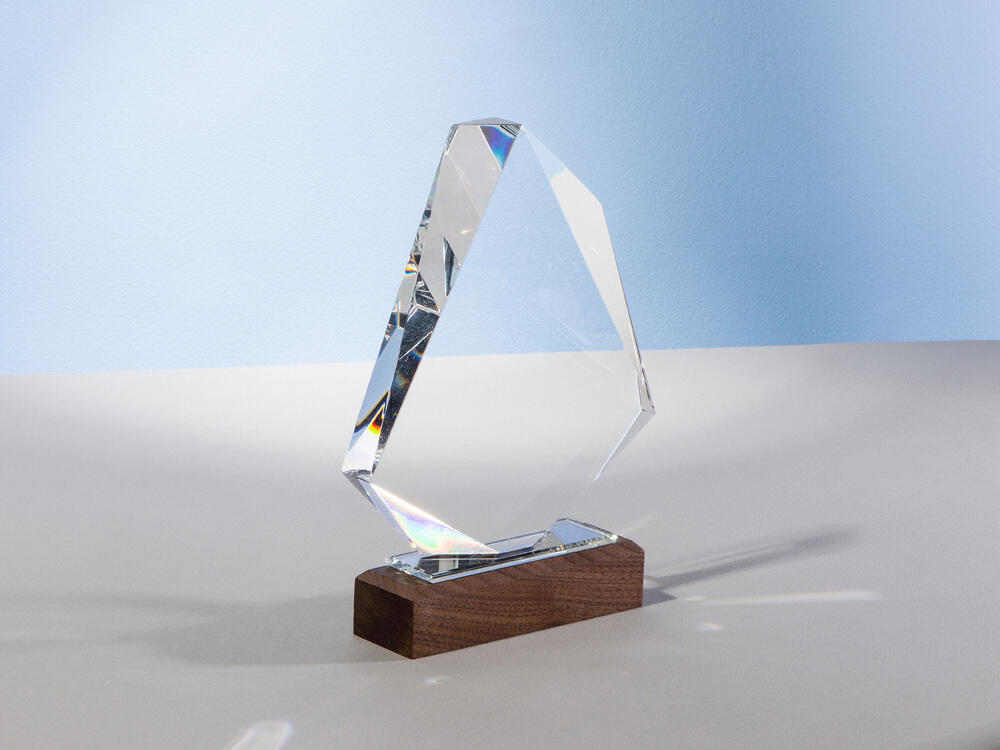 Награда выполнена из прозрачного стекла, имеет интересную асимметричную форму и расположена на деревянном постаменте.