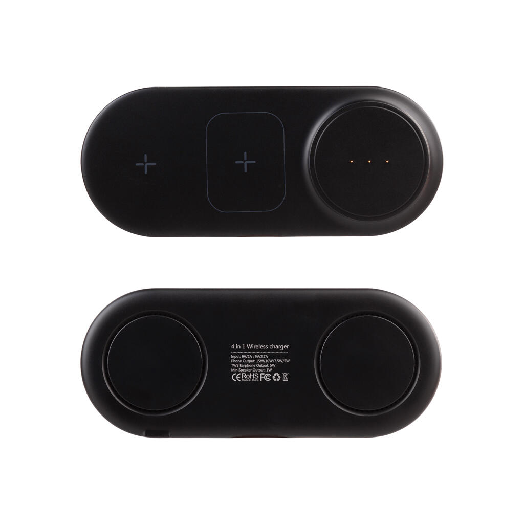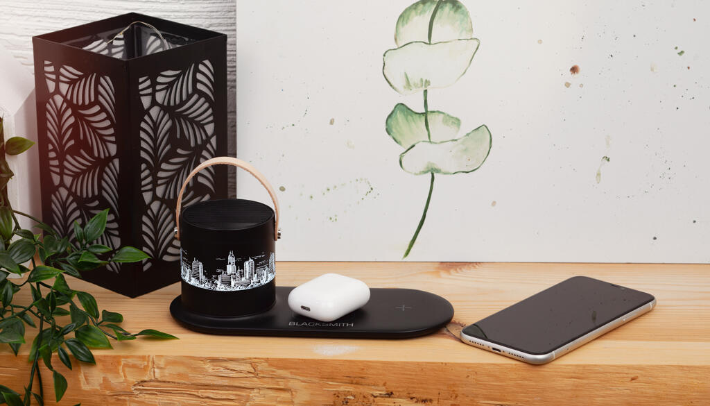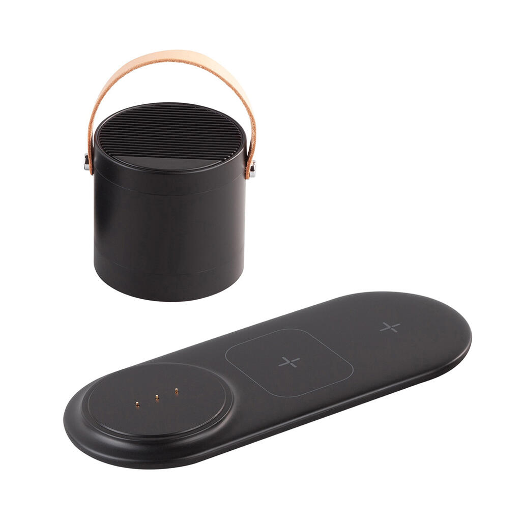 Комплексное предложение – настольный набор из мобильной bluetooth колонки и беспроводной зарядной станции с увеличенной мощностью передачи заряда (15W) для смартфона и наушников. Эффектное дополнение – круговая подсветка логотипа на корпусе колонки.