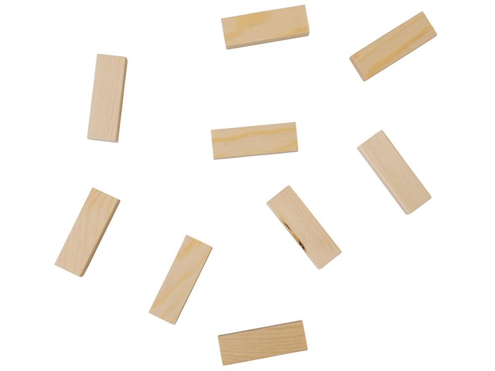 В комплекте — 54 бруска, изготовленных из натуральной сосны: лёгкие, прочные и приятные на ощупь. Все элементы аккуратно отшлифованы, что делает игру комфортной и безопасной даже для детей.