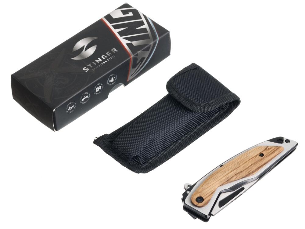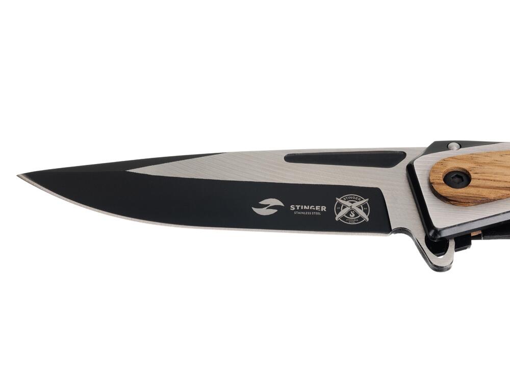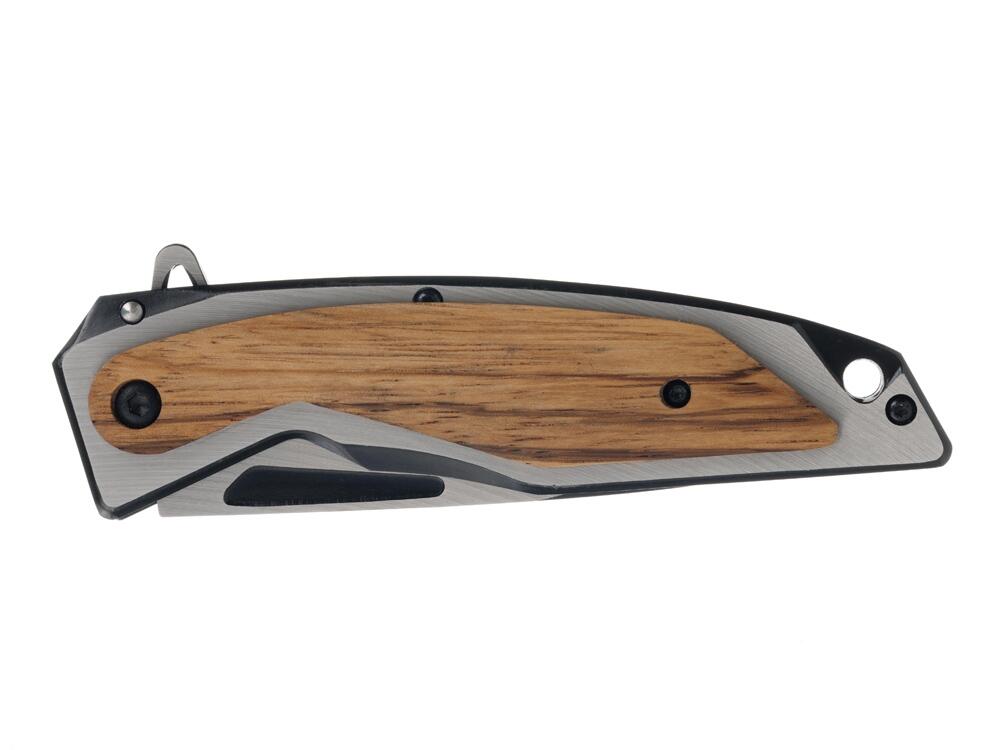 Рукоять ножа произведена из нержавеющей стали с накладками из древесины, собрана на втулках - “бонках”, поэтому при необходимости нож можно легко промыть. Нож быстро открывается при помощи флиппера с ассистом (механизм ускоренного открывания). На рукояти расположено отверстие для темляка и клипса для удобного размещения ножа в кармане.