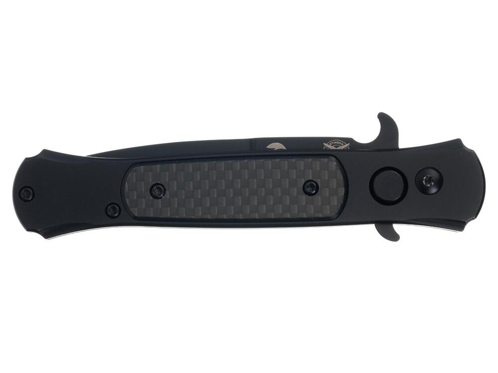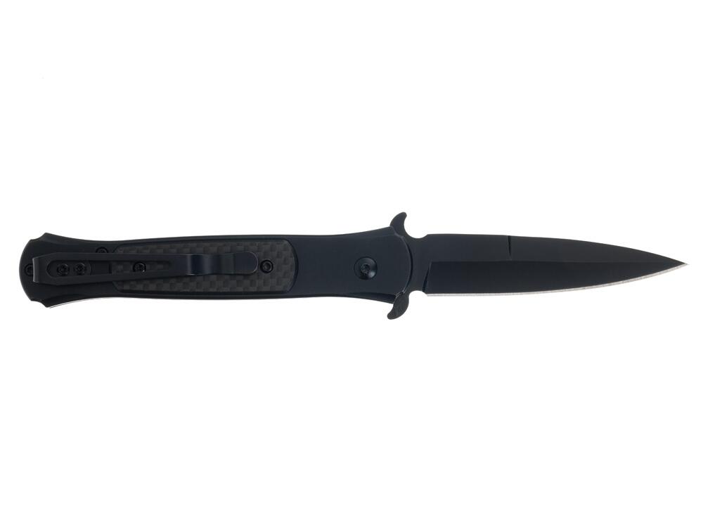 Рукоять ножа изготовлена из нержавеющей стали с накладками из карбона (углепластика) – это полимерный материал с композитным составом, изготовленный из переплетенных нитей углеродного волокна с использованием эпоксидных смол. Карбон является легким и исключительно прочным материалом, стойким к высоким температурам и агрессивным средам, отлично переносит влагу. Рукоять ножа собрана на втулках - “бонках”, поэтому при необходимости его можно легко промыть. На рукояти расположена съемная клипса для удобного размещения ножа в кармане. Нож мгновенно открывается и надежно фиксируется благодаря замку Button Lock. Дополнительные упоры на клинке могут выполнять функцию гарды, предотвращая соскальзывание руки на лезвие клинка.