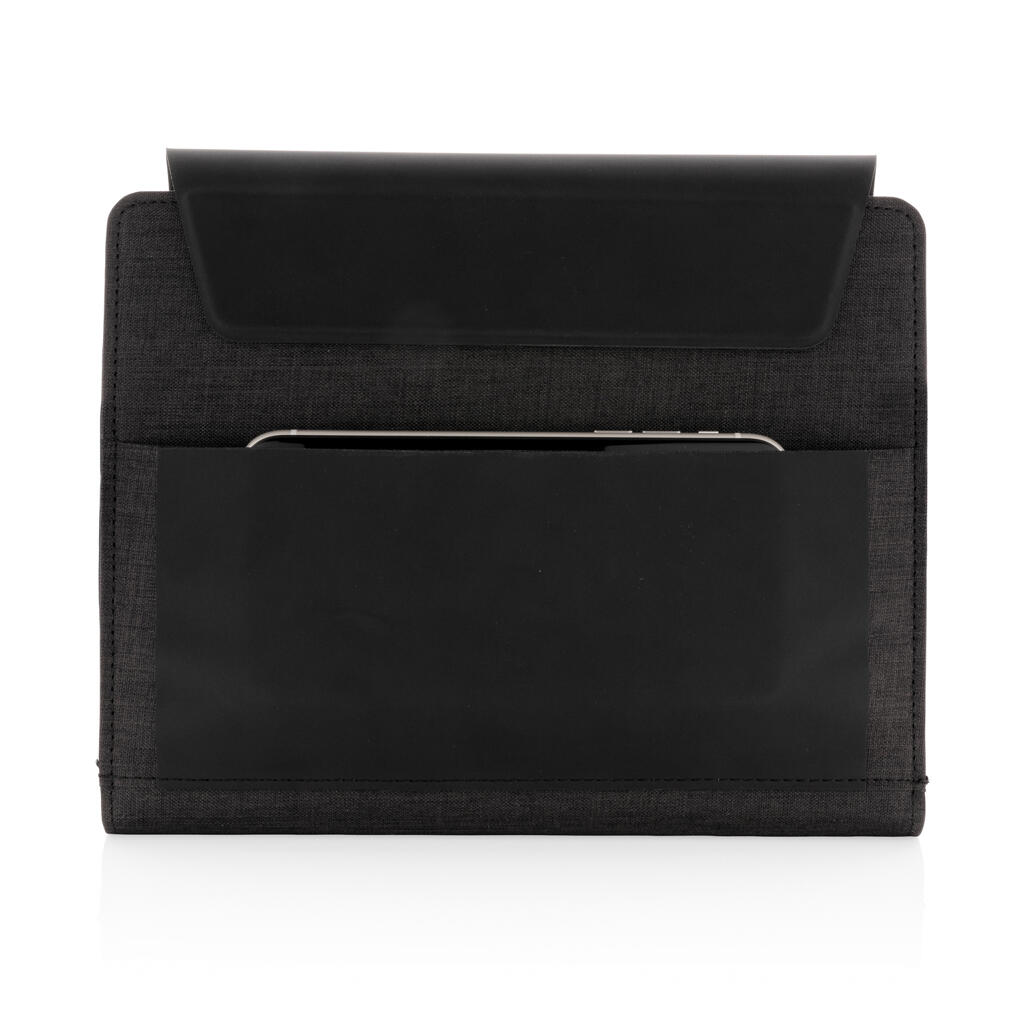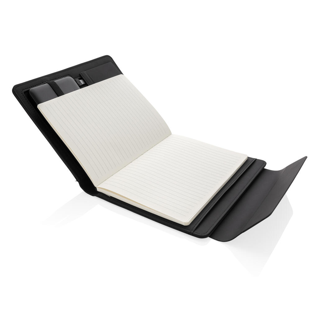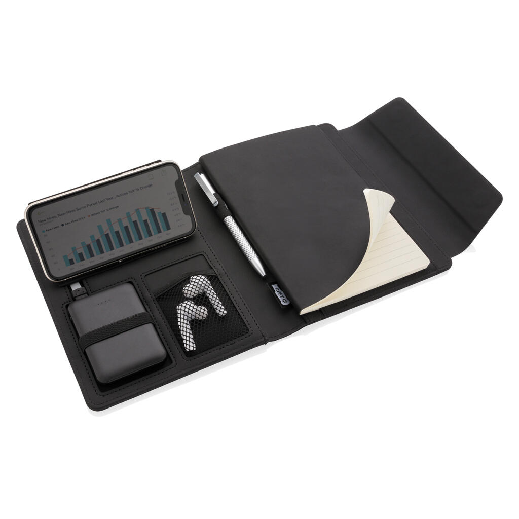 Самые нужные вещи под рукой с этим красивым органайзером формата А5. Оснащен функцией беспроводной зарядки, чтобы вы всегда оставались на связи. В комплекте внешний аккумулятор, который можно использовать как самостоятельное устройство. В органайзере есть встроенная подставка для телефона с функцией беспроводной зарядки, эластичный держатель для ручки и дополнительные сетчатые карманы, а также блокнот на 64 листа/128 страниц линованной кремовой бумаги плотностью 70 г/м2. Сделан из RPET и PU. Вход: 5 В / 2 А. Выход: 5 В / 2 А. Беспроводной вход: 5 В / 2 А; выход: 5 В / 1 А. Поставляется в подарочной упаковке.
