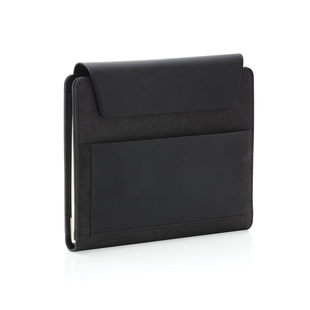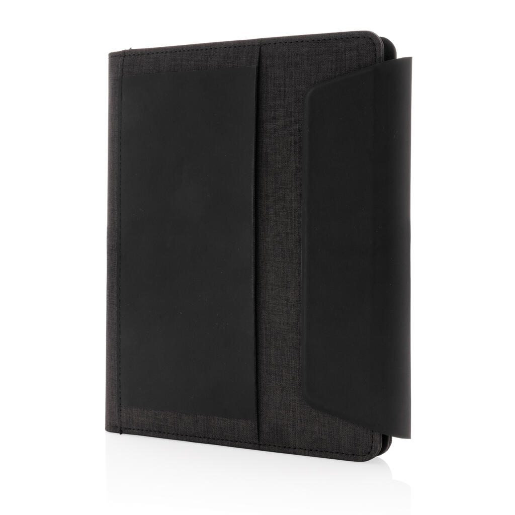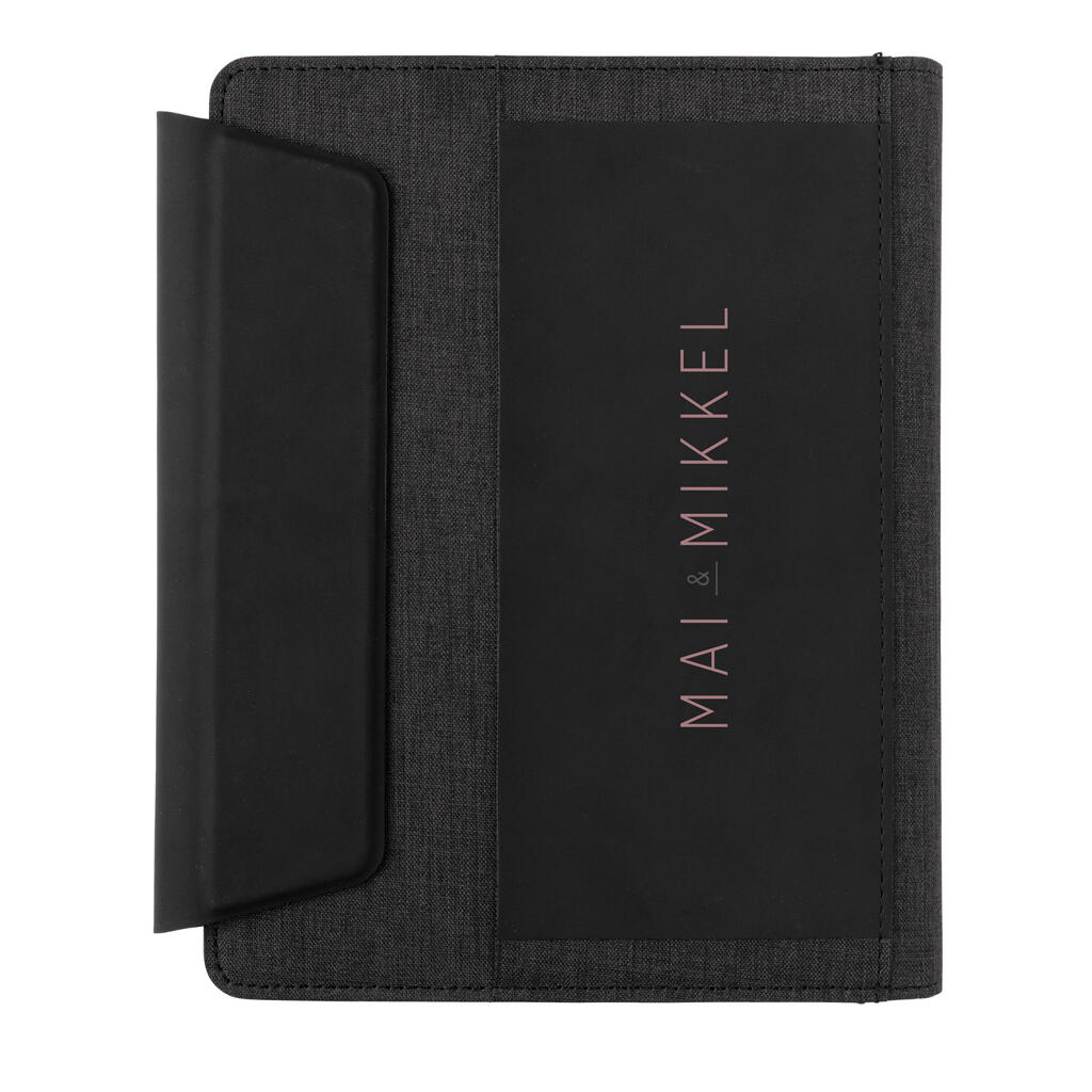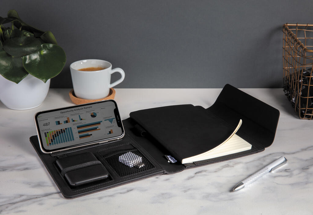Самые нужные вещи под рукой с этим красивым органайзером формата А5. Оснащен функцией беспроводной зарядки, чтобы вы всегда оставались на связи. В комплекте внешний аккумулятор, который можно использовать как самостоятельное устройство. В органайзере есть встроенная подставка для телефона с функцией беспроводной зарядки, эластичный держатель для ручки и дополнительные сетчатые карманы, а также блокнот на 64 листа/128 страниц линованной кремовой бумаги плотностью 70 г/м2. Сделан из RPET и PU. Вход: 5 В / 2 А. Выход: 5 В / 2 А. Беспроводной вход: 5 В / 2 А; выход: 5 В / 1 А. Поставляется в подарочной упаковке.