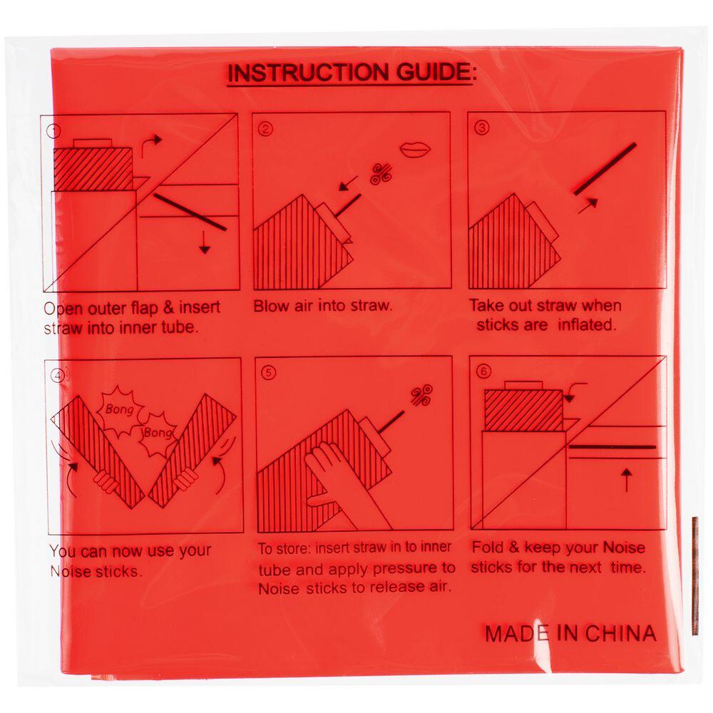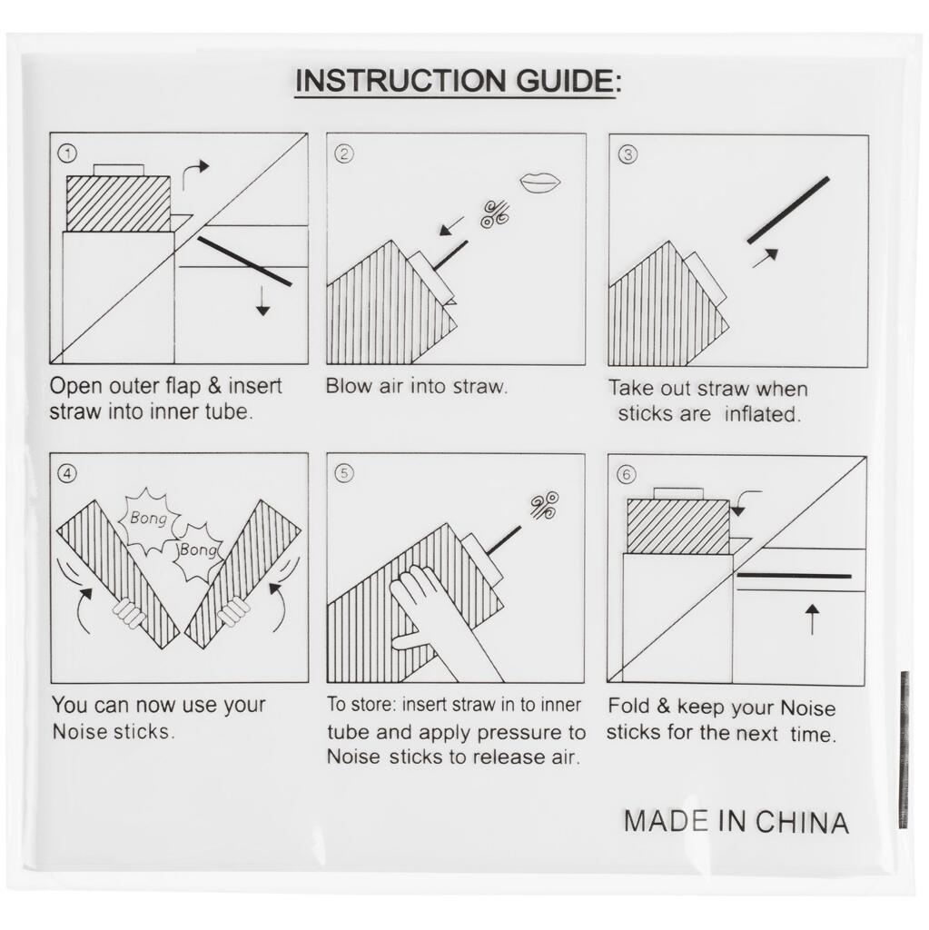 1. Достаньте палки-стучалки из пакета и расправьте. 2. Вставьте трубочку между стенками воздушного клапана. 3. Надуйте. 4. Выньте трубочку из клапана — он закроется автоматически и палки-стучалки не будут самопроизвольно сдуваться. 5. Чтобы сдуть палки-стучалки, снова вставьте трубочку в клапан и аккуратно спустите воздух.
