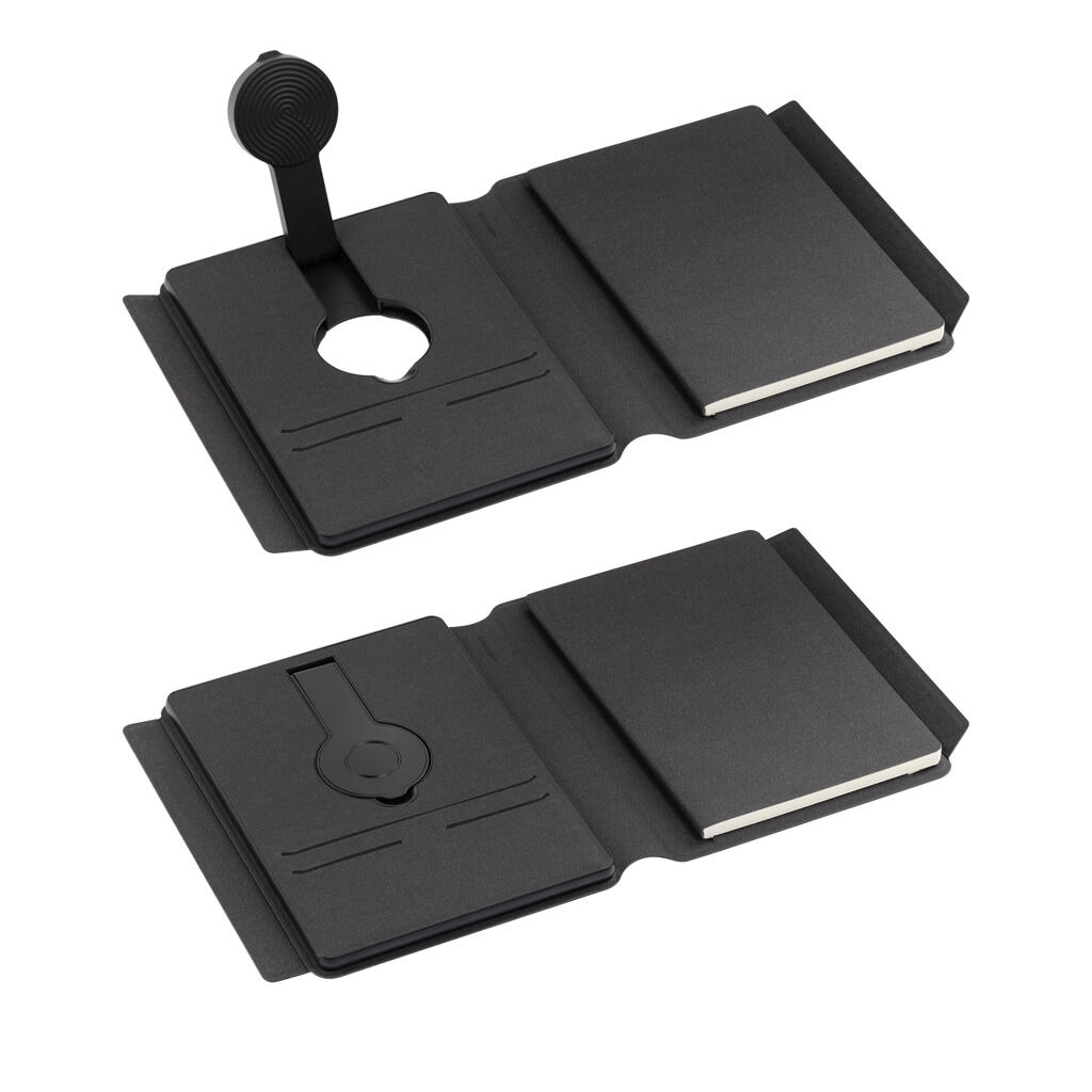 Нетривиальная конструкция двустороннего зарядного блока со встроенной магнитной функцией MagSafe позволяет заряжать беспроводным способом смартфоны, смарт-часы и наушники. Для проводной зарядки можно использовать разъём Type-C с индикаторами уровня заряда встроенной в папку батареи. В комплект входит съёмный блокнот А5 с мягкой обложкой (128 страниц в линейку кремовой бумаги плотностью 80гр./м2).