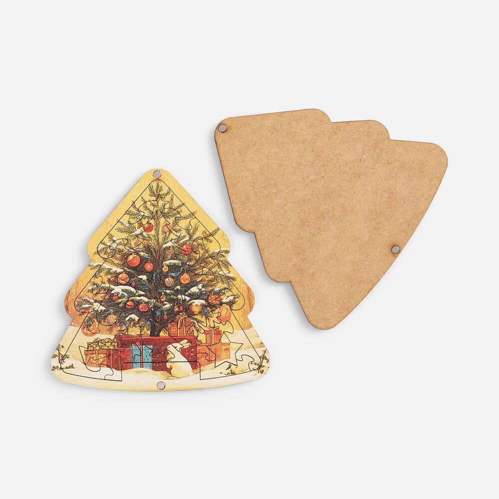 Очаровательный пазл в форме елочки — воплощение новогоднего уюта и тепла. Идеально украшенная елка в окружении подарков на фоне заснеженного пейзажа — просто сама гармония праздника. Такой стиль классической новогодней открытки подарит особое настроение и предвкушение волшебства!