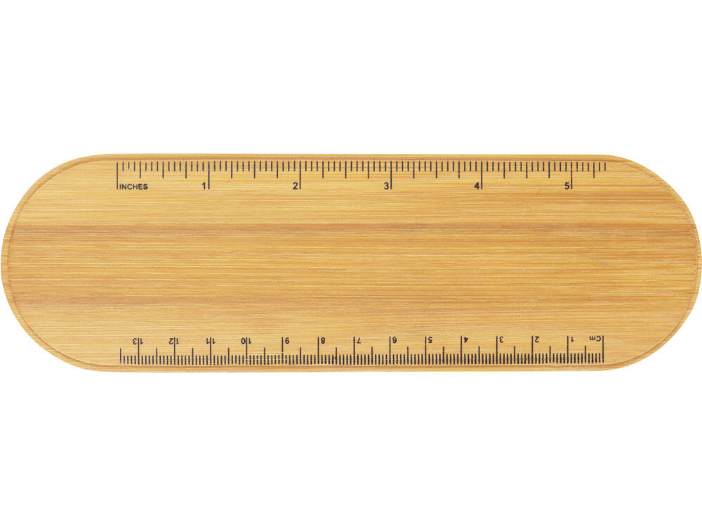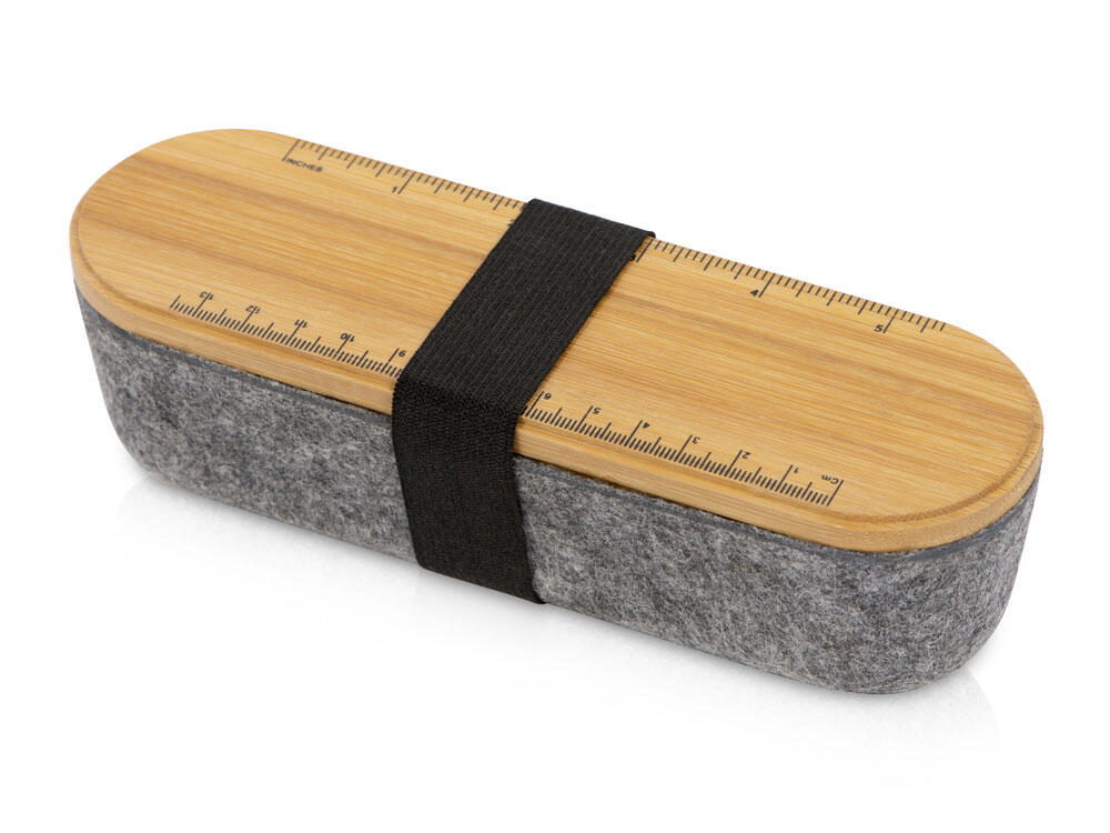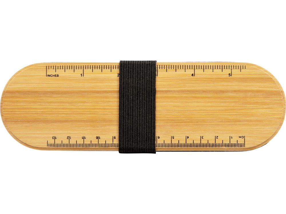Пенал для ручек и карандашей с бамбуковой крышкой. На крышке есть линейка с несколькими метрическими системами, с оборотной стороны крышки находится выемка, которая может служить подставкой для телефона.