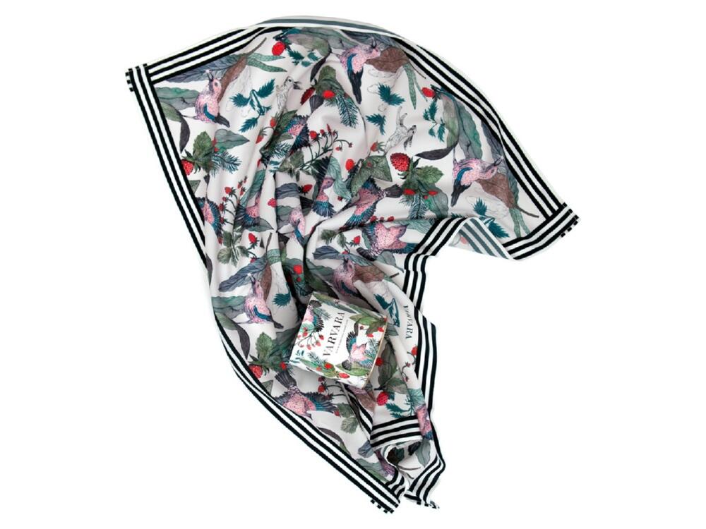 Принт нарисован художницей вручную специально для бренда Varvara. Художница размышляла на тему русской природы, культуры и искусства - тут и лесная земляника, и сочная зелень, и сказочные зайцы с фазанами. Композиция рисунка, выполненная в стиле иллюстраций к русским сказкам, переносит нас в атмосферу сказочного леса.
