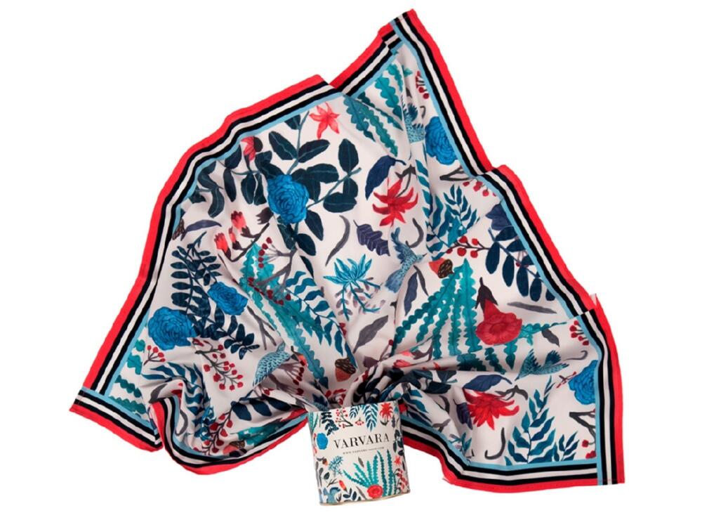 Авторский принт написан художницей вручную специально для российского бренда Varvara. Художница размышляла на тему русской природы, культуры и искусства: в основе принта лежат листья папоротника, соцветия клюквы, бутоны розы и загадочные птицы. Композиция рисунка напоминает иллюстрацию к русским сказкам.