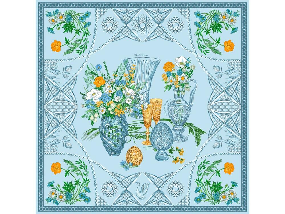 Дизайн платка связан со стилевой эстетикой советской школы натюрморта. Перед нами ажурная скатерть стола, декорированного композицией из хрусталя и полевыми цветами. Нежные переливы сине-голубых тонов подчеркнуты ярко-желтыми и белыми бутонами, стеблями сочных трав и золотистыми бокалами. Ажур скатерти вторит хрустальному узору фужеров, ваз и сувенирных пасхальных яиц, задавая душевное настроение.