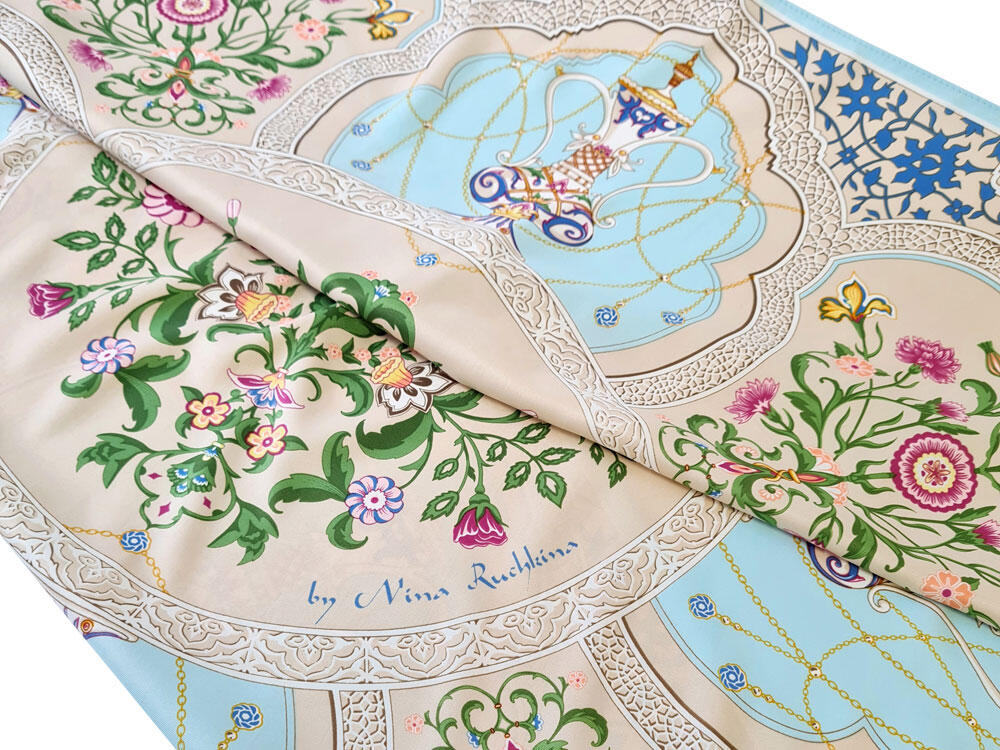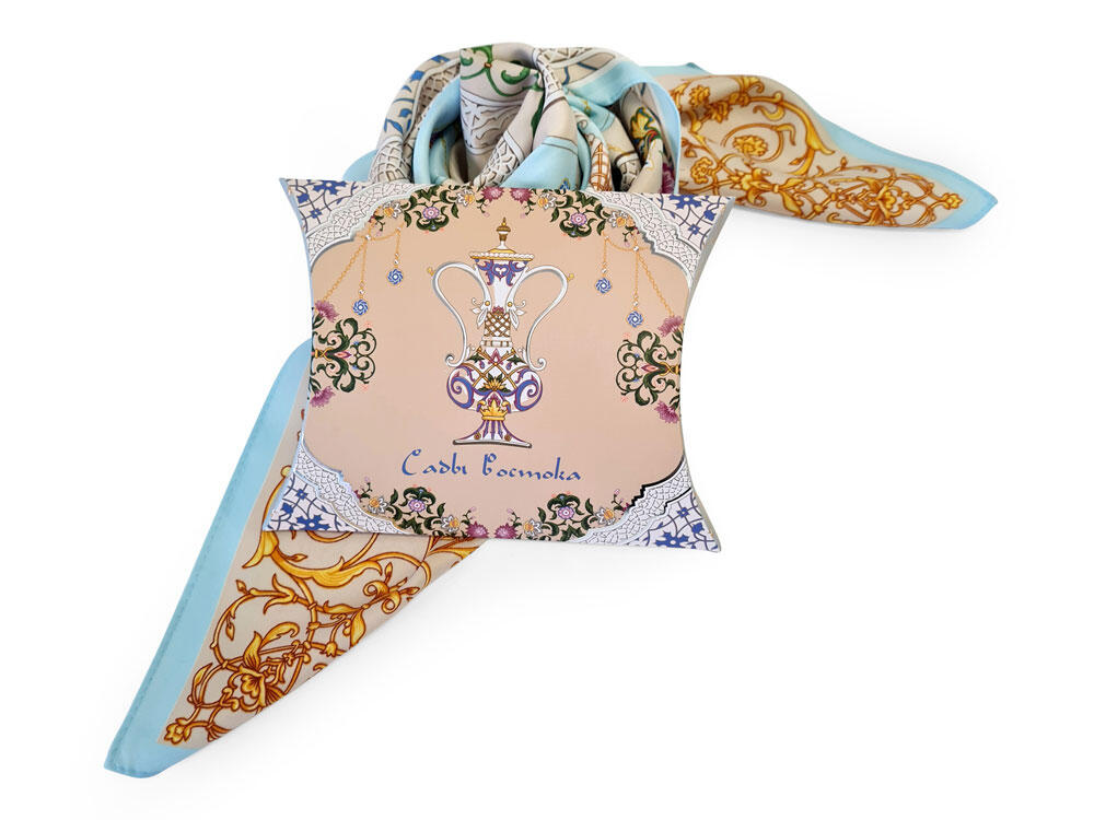 Платок “Сады Востока” от бренда “Русские в моде” by Nina Ruchkina посвящен экзотической красоте, женской привлекательности и очарованию. В центре полотна расположились цветы дивного сада, олицетворяющие собой процветание, мир и земную любовь. Рядом изображены кувшины, наполненные росой молодости и секретами вечно цветущих восточных красавиц.