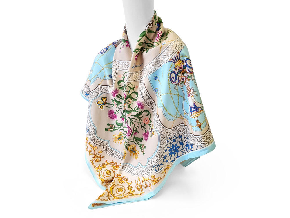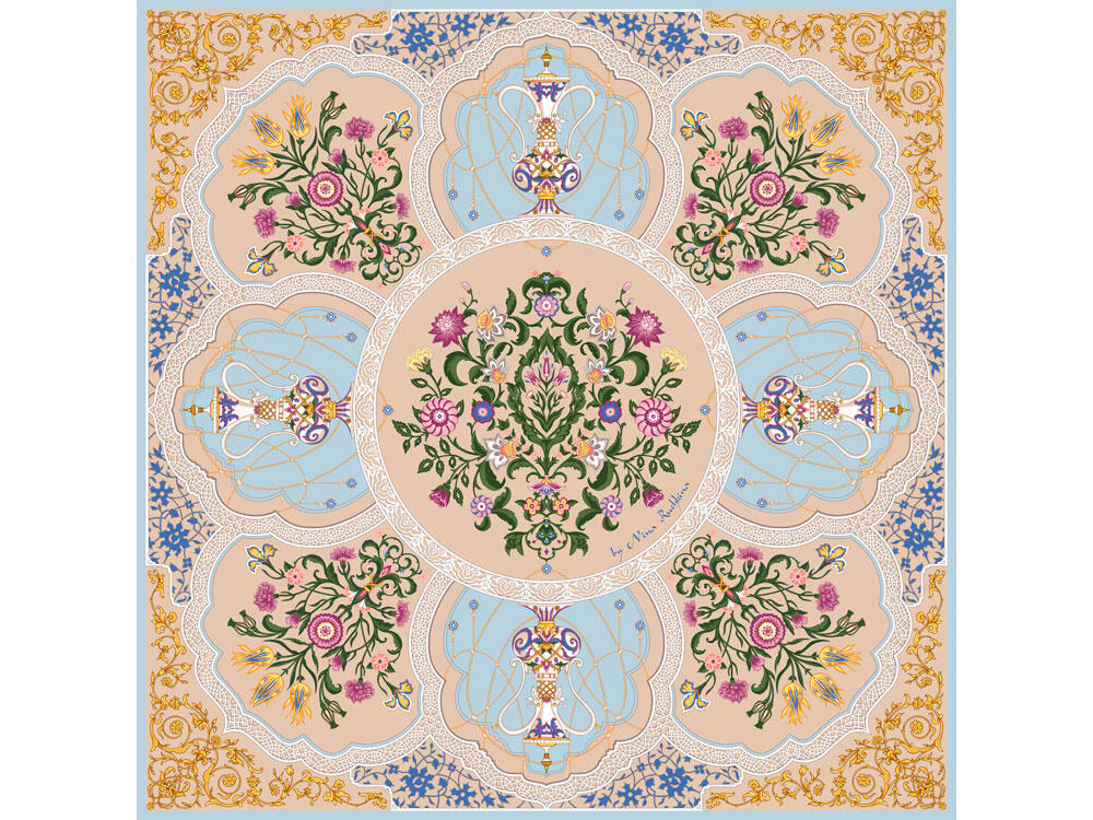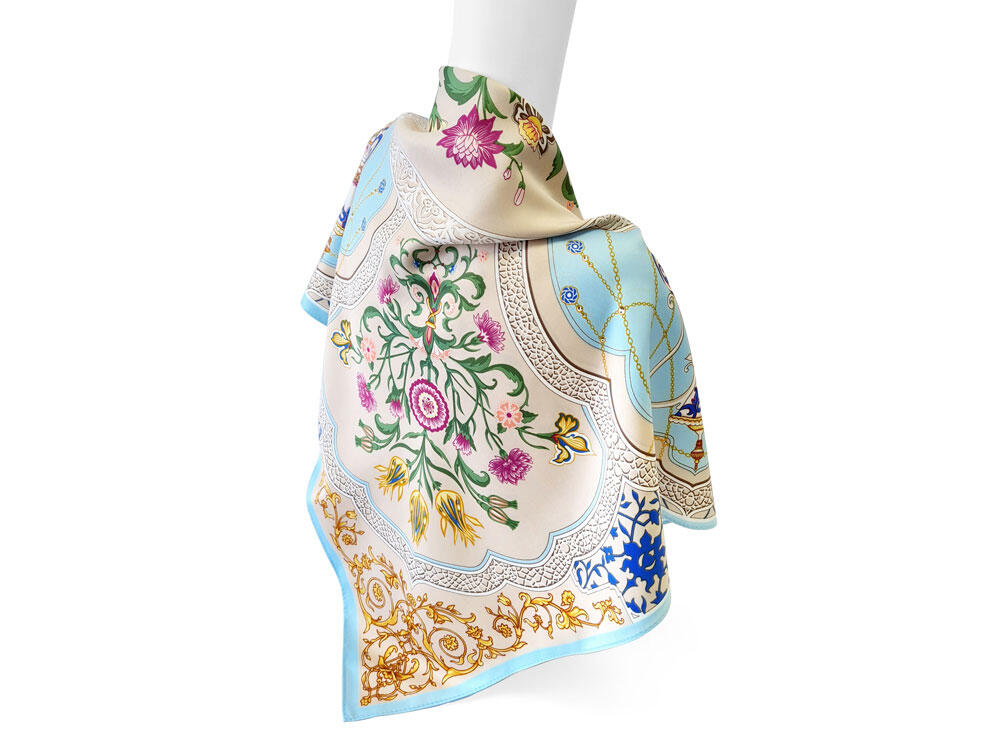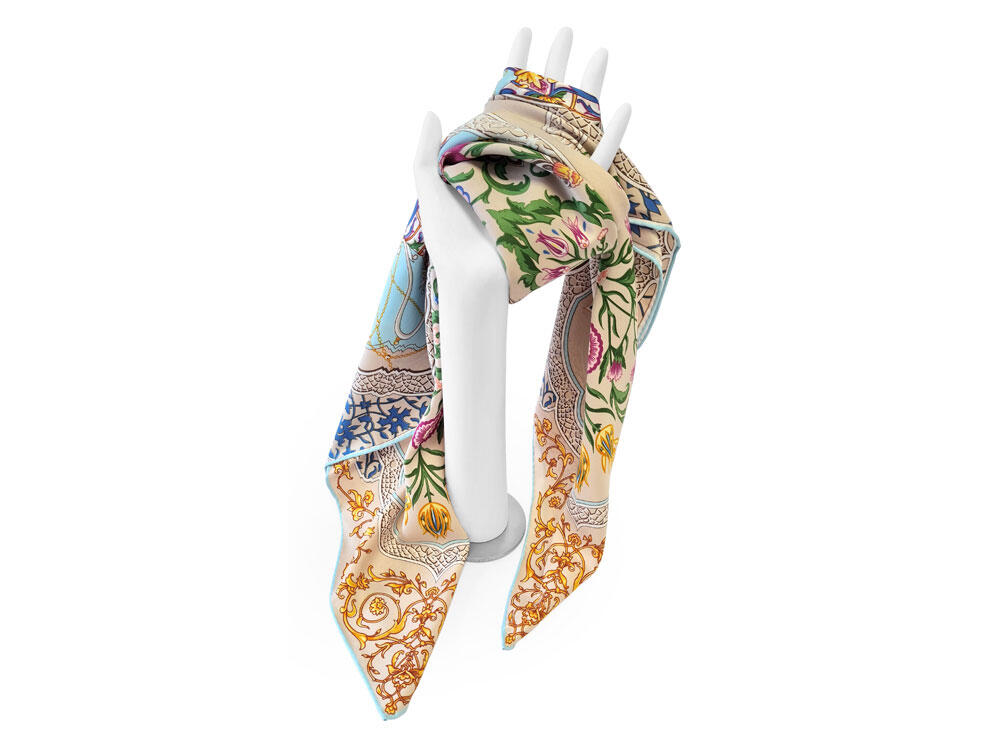 Принт аксессуара образуют знаменитые орнаменты востока — гирих (бесконечный “узел”) и ислими (“путь в божественный сад”). Непрерывные витиеватые линии в сочетании с узорами из гибких стеблей с зеленой листвой и пестрыми соцветиями завораживают, погружают в состояние медитации, постижения тайны мироздания через призму счастья и красоты.