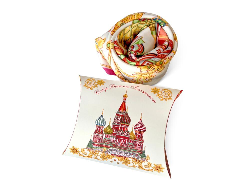 Сказочный вид собора отражен на золотом фоне новинки от бренда «Русские в моде» by Nina Ruchkina. Настоящее восьмое “чудо Света” обрамлено царскими коронами и райскими птицами, свидетельствующими об уникальности и роскоши этой исторической достопримечательности, отстроенной 1 октября 1552 года на праздник Покрова Богородицы.