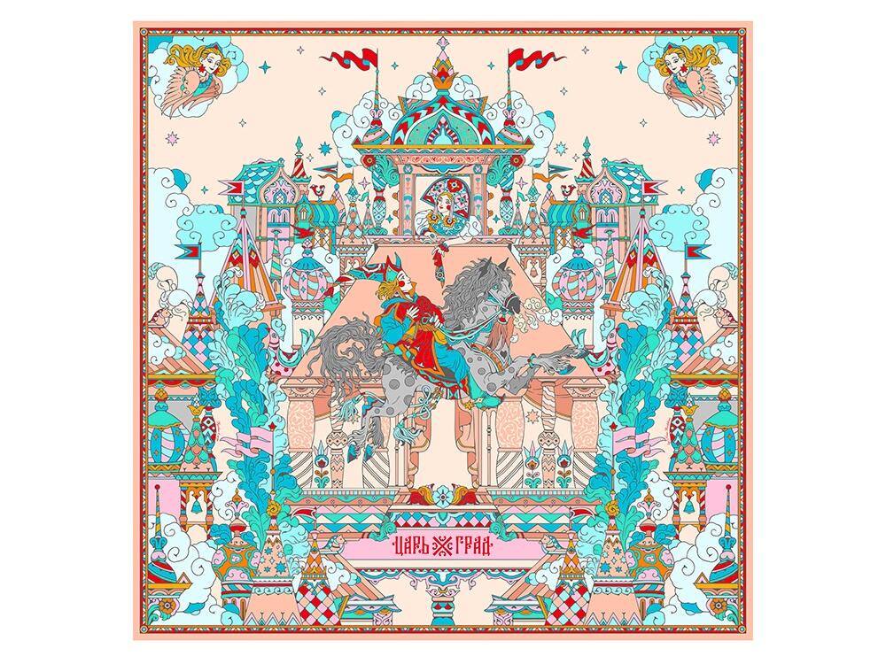Платок «Царьград» создан в партнерстве с одноименным загородным курортом, где чтут лучшие обычаи русского гостеприимства. Дизайн платка обращен к воплощению народной традиции чародейства и сказки. Сюжет иллюстрирует фольклорную сцену из произведения «Сивка-Бурка» о победе истинного чувства и исполнении желаний.
